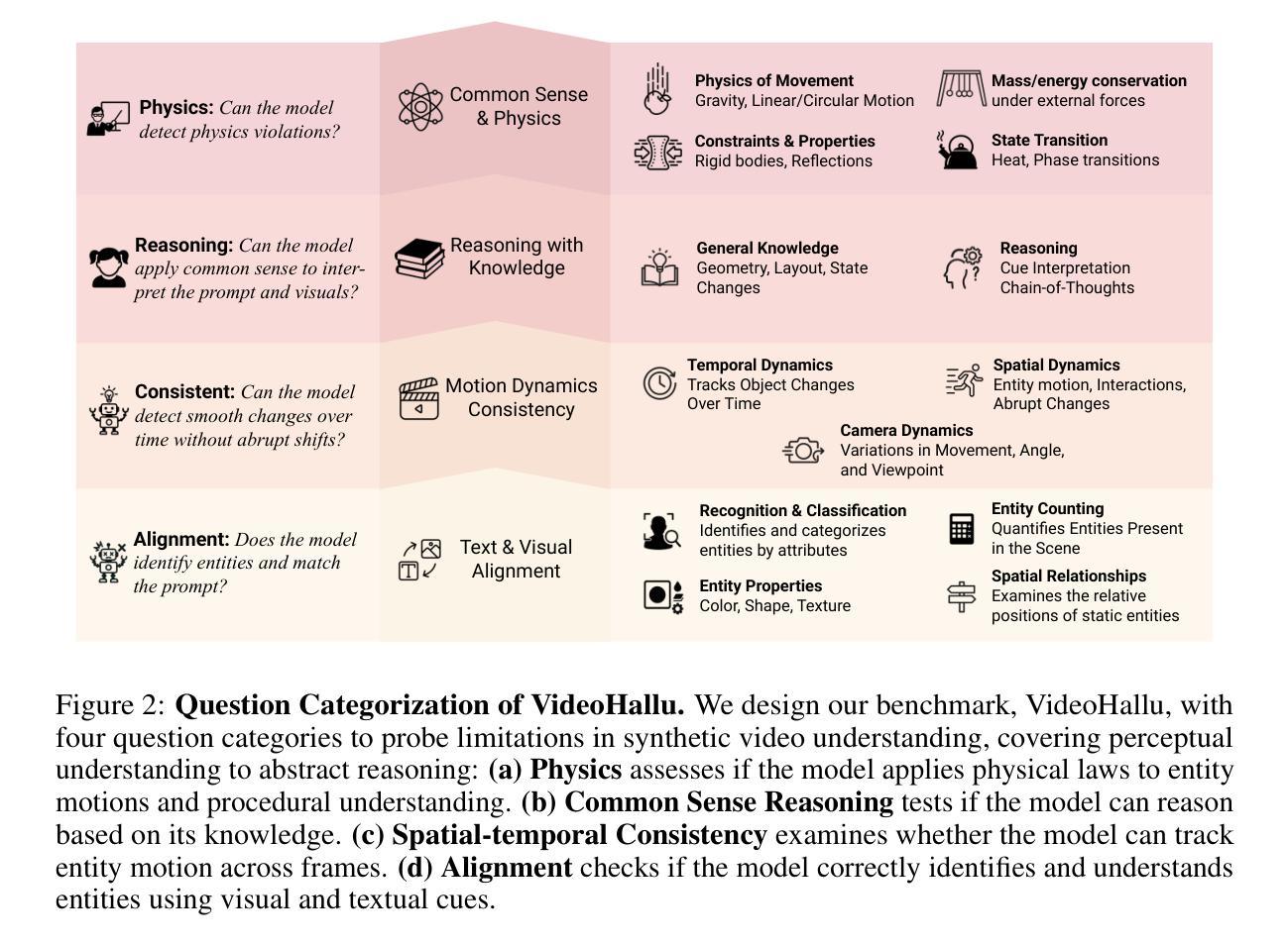 - 介绍了一个名为VideoHallu的合成数据集,包含违反物理和常识的场景,用于测试模型的视觉理解能力。