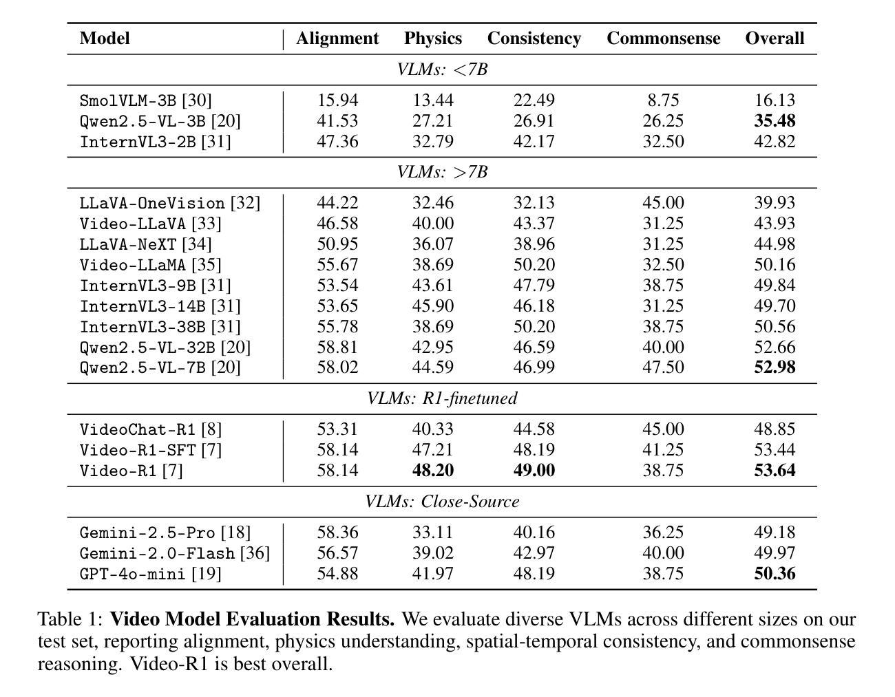 - 当前评估方法主要使用与训练数据相似的现实世界视频,因此高基准测试分数可能无法反映真正的推理能力。