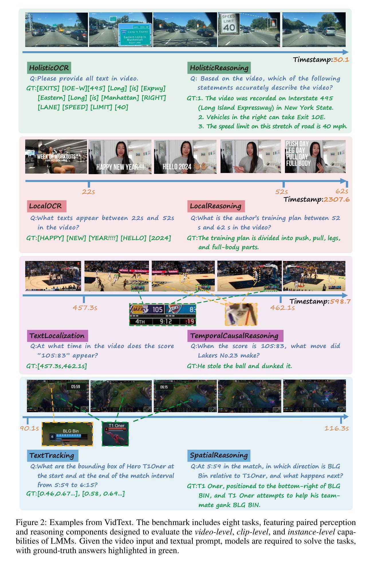 - VidText提供配对感知推理任务,涉及视觉文本感知和跨模态推理。