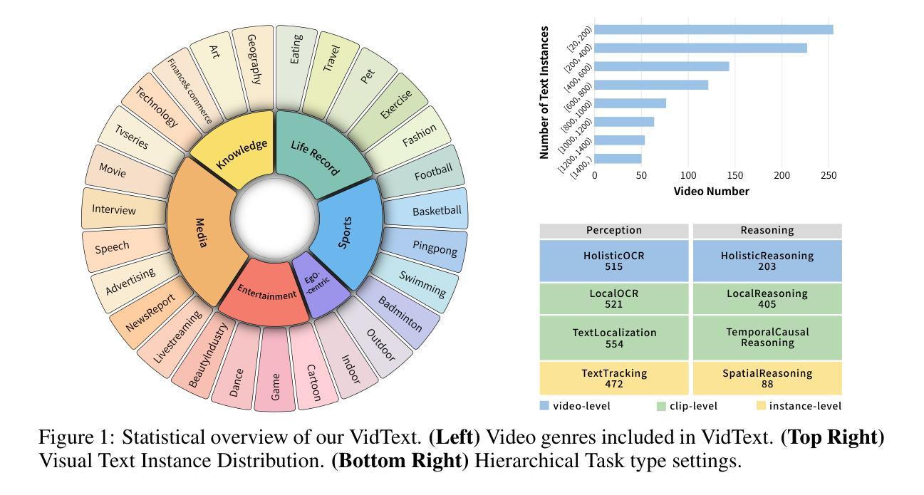- VidText填补了视频文本理解的基准测试空白,覆盖多种现实场景并支持多语言。