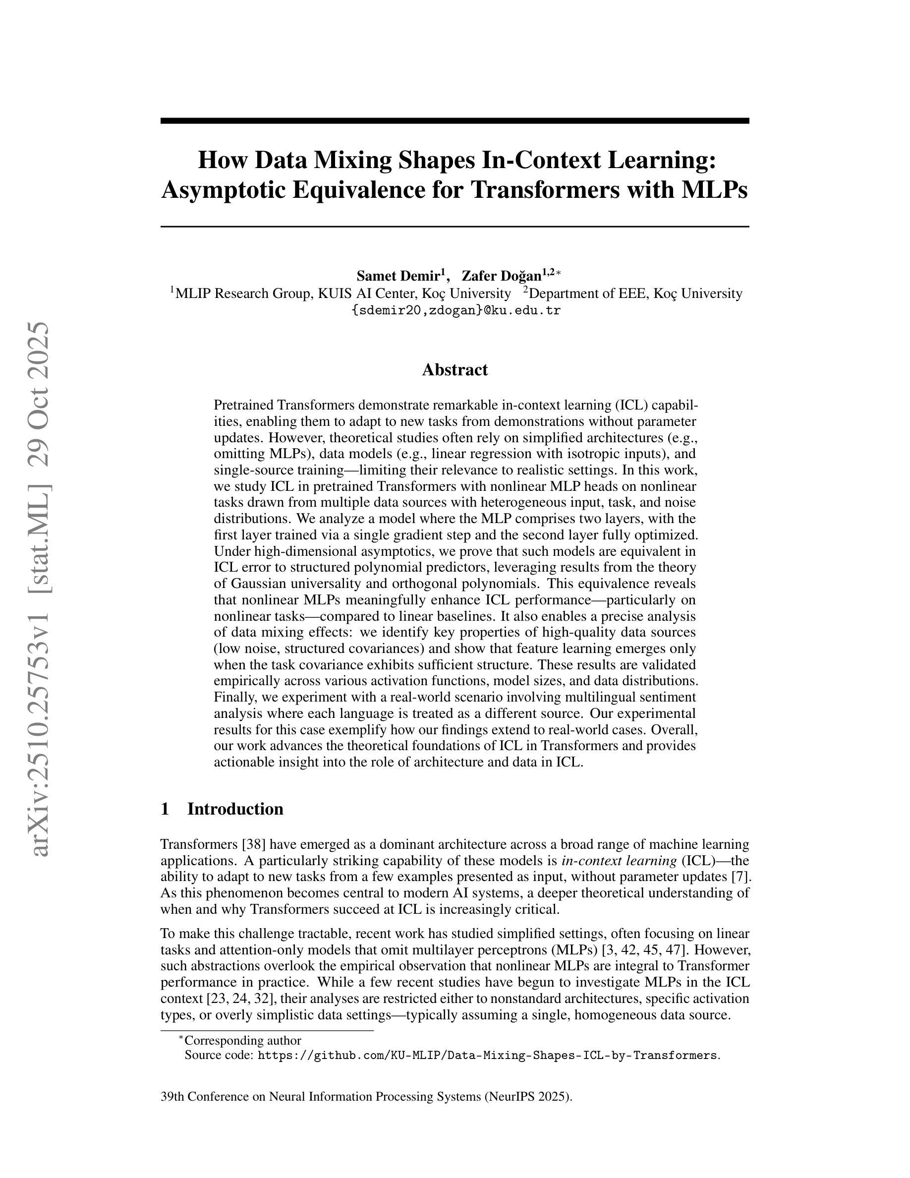 预训练Transformer表现出惊人的上下文学习(ICL)能力,能够使它们通过演示适应新任务而无需更新参数。然而,理论研究通常依赖于简化的架构(例如,省略多层感知器(MLPs))、数据模型(例如,具有同向输入的线性回归)和单源训练,这限制了它们在实际环境中的相关性。在这项工作中,我们研究了在预训练的Transformer上使用非线性多层感知器头进行上下文学习,这些任务来自多个数据源,具有不同的输入、任务和噪声分布。我们分析了一个MLP包含两层模型的情况,其中第一层通过单个梯度步骤进行训练,第二层进行完全优化。在高维渐近的情况下,我们证明了这种模型在ICL误差方面等同于结构化多项式预测器,这得益于高斯普遍性和正交多项式的理论结果。这种等价关系表明,与线性基线相比,非线性MLP在非线性任务上能显著提高ICL性能。它还使我们能够精确分析数据混合效应:我们确定了高质量数据源的关键属性(低噪声、结构化协方差),并表明只有在任务协方差表现出足够的结构时才会出现特征学习。这些结果在不同的激活函数、模型大小和数据分布上得到了实证验证。最后,我们用一个涉及多语言情感分析的现实场景进行实验,其中每种语言被视为一个不同的来源。我们在该案例中的实验结果例证了我们的发现如何扩展到现实情况。总体而言,我们的工作推进了Transformer中ICL的理论基础,并为架构和数据在ICL中的作用提供了可操作性的见解。
