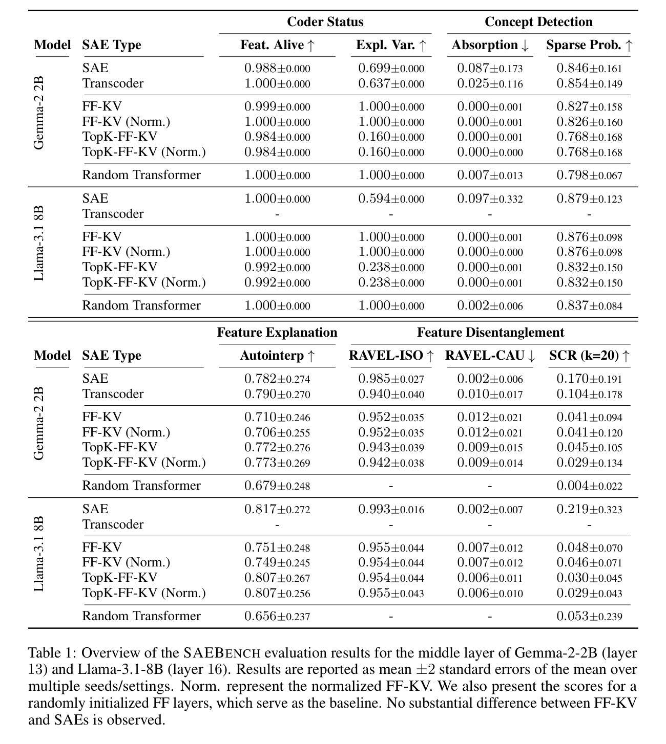 - SAE在某些方面略有改进,但在其他方面,基础FF层表现出更好的可解释性。