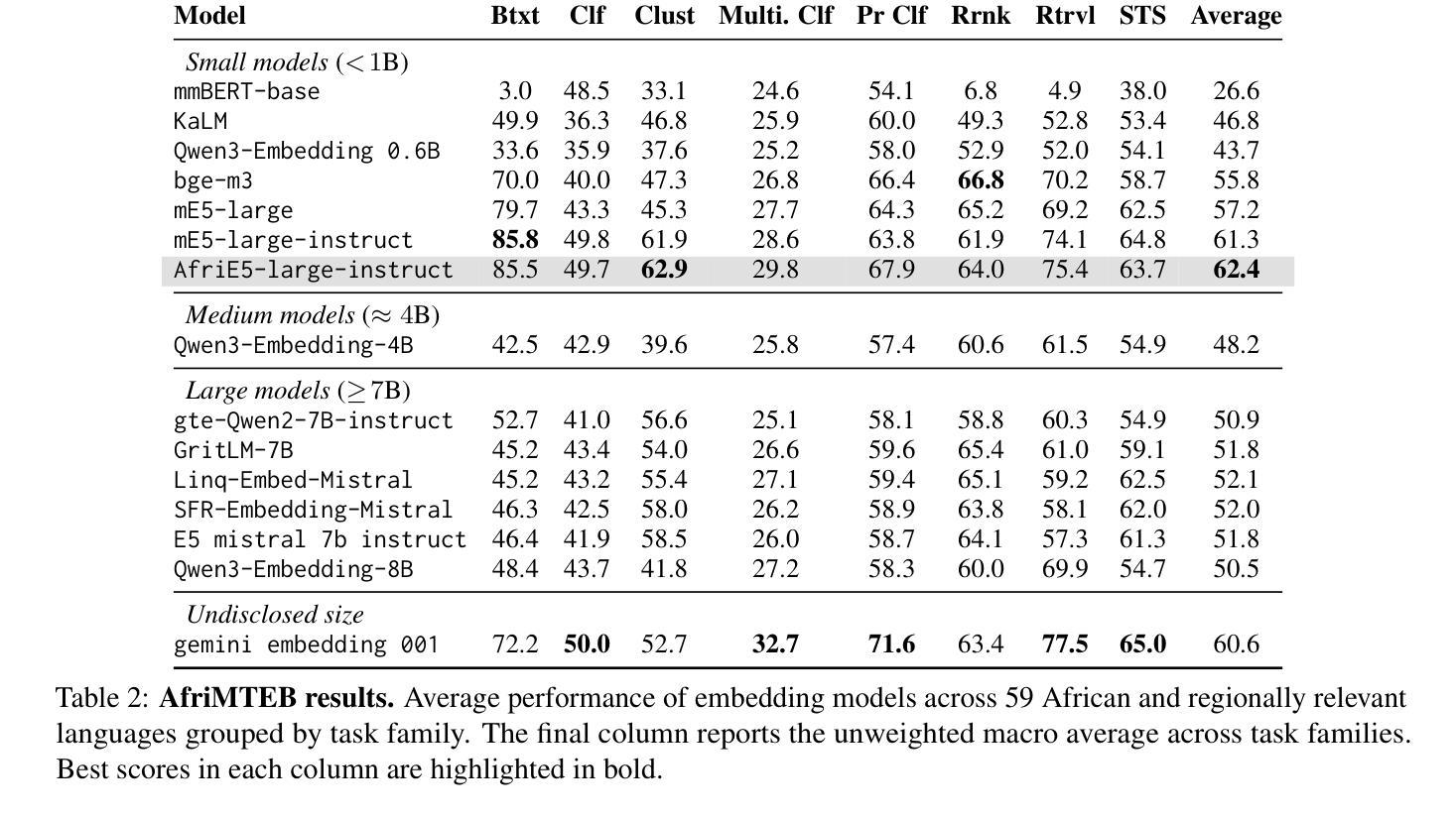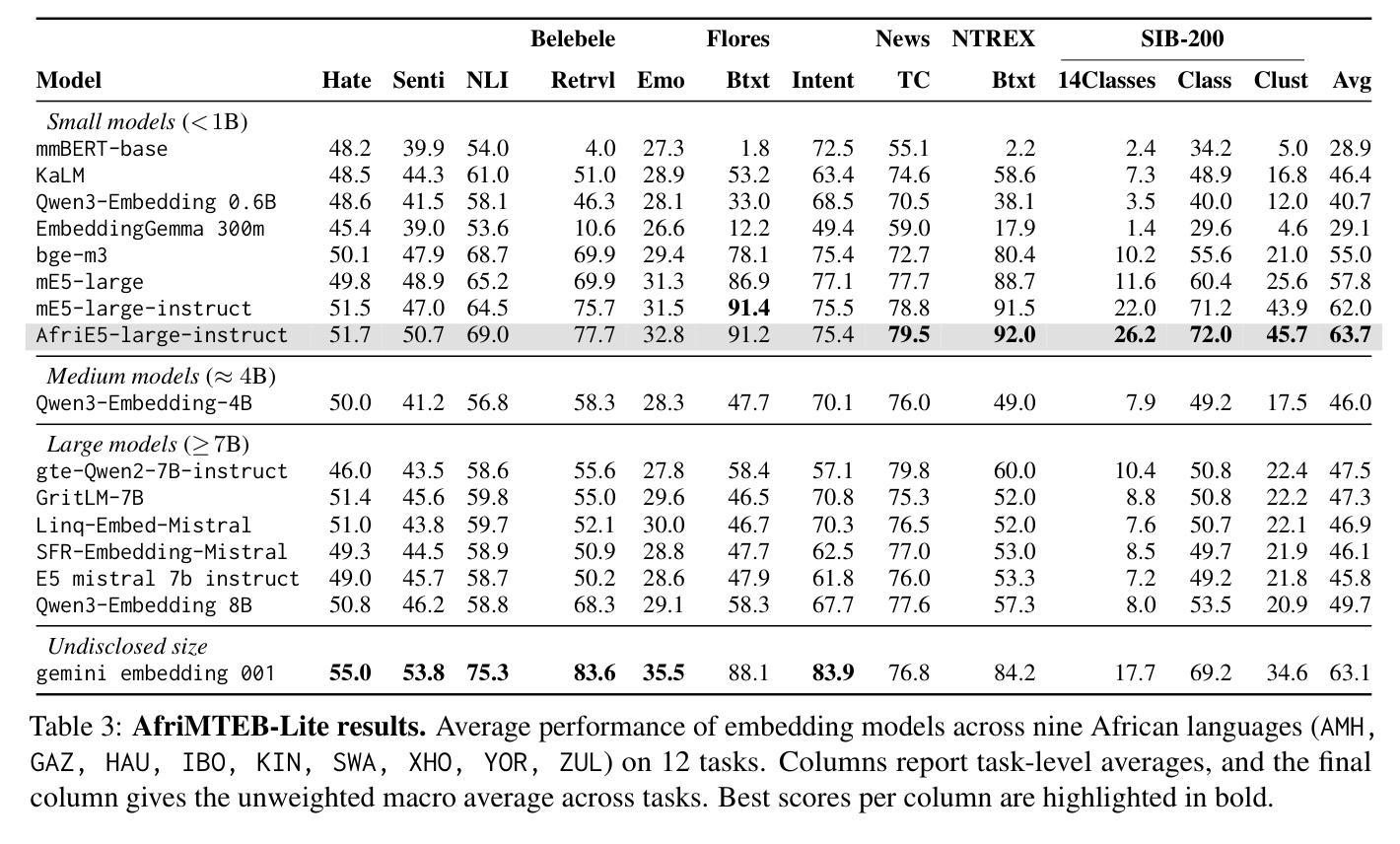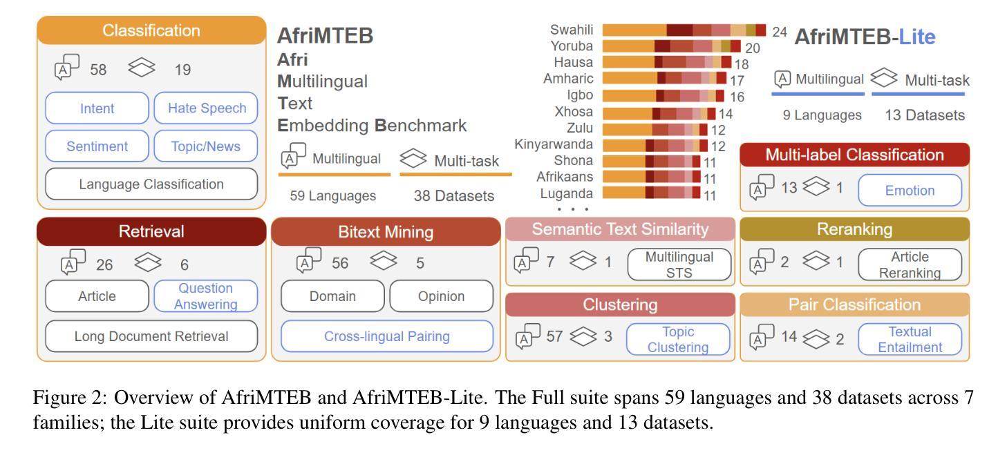 文本嵌入是多个NLP任务的关键构建组件,如增强生成任务,这对于防止大型语言模型中的幻视至关重要。尽管最近发布了大规模多语言文本嵌入(MMTEB),但非洲语言仍然被低估,现有任务通常是从翻译基准测试(如FLORES聚类或SIB-200)重新利用。在本文中,我们介绍了AfriMTEB——MMTEB的区域扩展,覆盖59种语言、14项任务和38个数据集,包括新增的六个数据集。与许多包含不到五种语言的MMTEB数据集不同,新增部分涵盖了14至56种非洲语言,并引入了以前未涵盖的全新任务,如仇恨言论检测、意图检测和情绪分类等。作为补充,我们推出了AfriE5,这是通过跨语言对比蒸馏对非洲语言进行指令调优的mE5模型的适应版本。我们的评估显示,AfriE5达到了最新性能水平,超过了如Gemini-Embeddings和mE5等强大的基线模型。