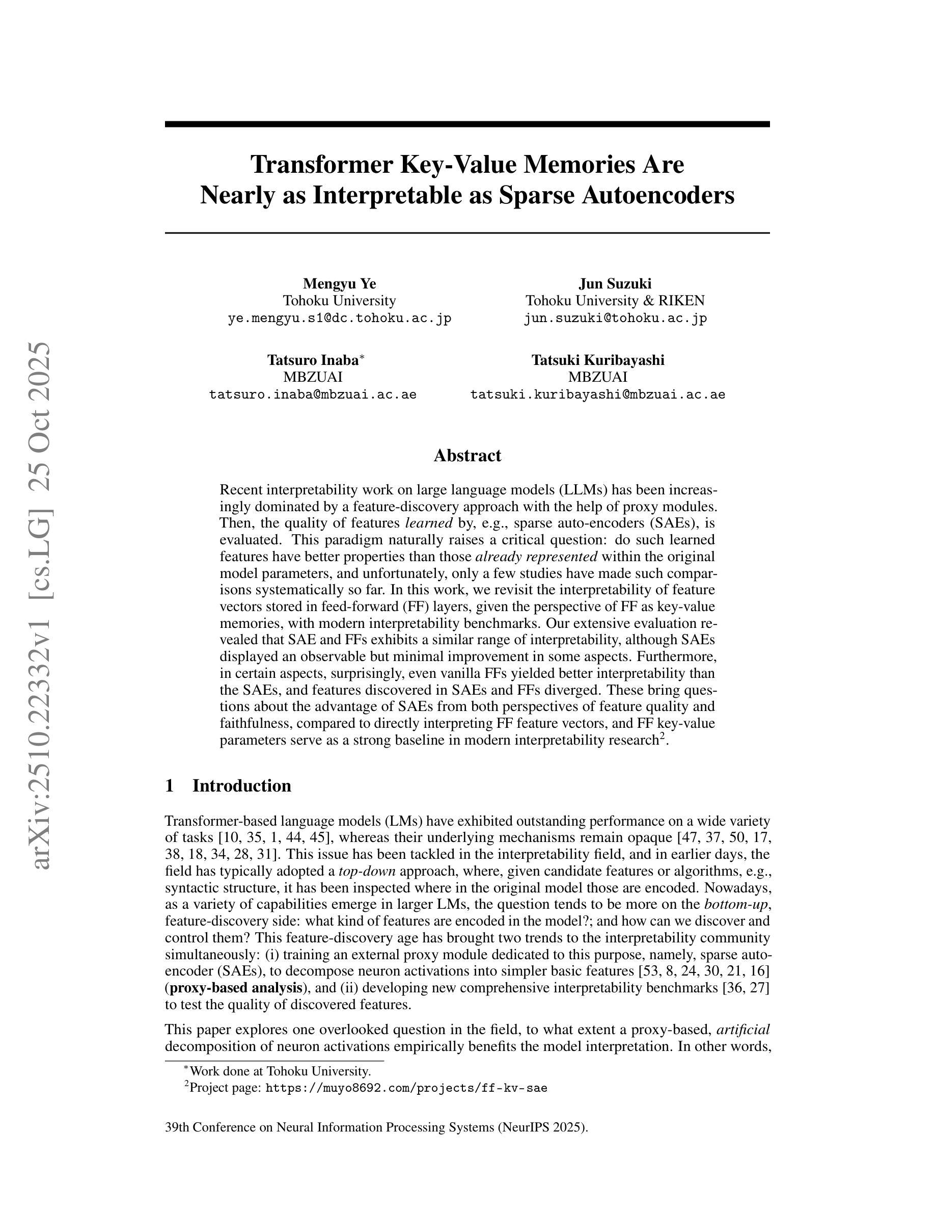 近期关于大型语言模型(LLM)的可解释性研究主要集中于通过代理模块发现特征的方法,并评估如稀疏自动编码器(SAE)等学习到的特征质量。然而,关于这些学习到的特征是否比原始模型参数中的特征具有更好的性质,仅有少数研究进行了系统比较。本研究从前馈(FF)层作为键值记忆的角度重新审视了其可解释性,并利用现代可解释性基准进行了评估。研究发现,SAE和FF层具有相似的可解释性范围,但SAE在某些方面略有改进。同时,令人惊讶的是,在某些方面,即使是最基础的前馈层也表现出了比SAE更好的可解释性,且SAE和前馈层中发现的特征存在分歧。这为现代可解释性研究带来了新的疑问和讨论,尤其是在特征质量和忠实度方面的对比上,而FF键值参数为可解释性研究提供了一个强有力的基准。
