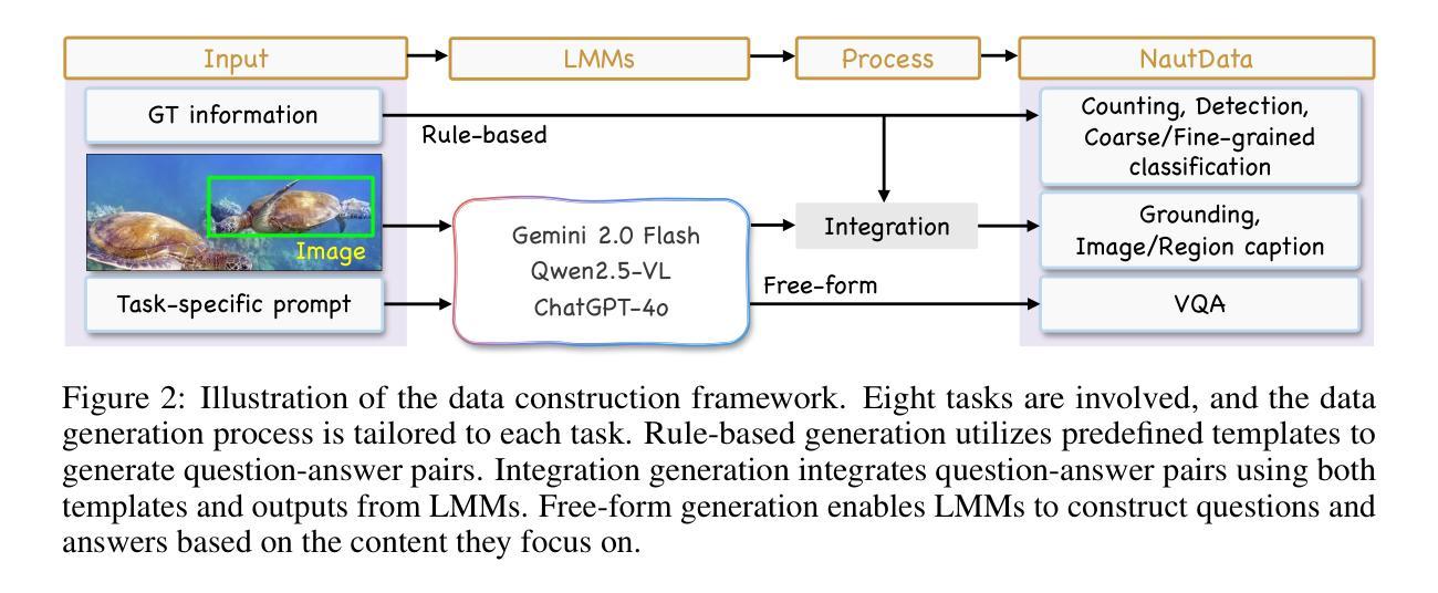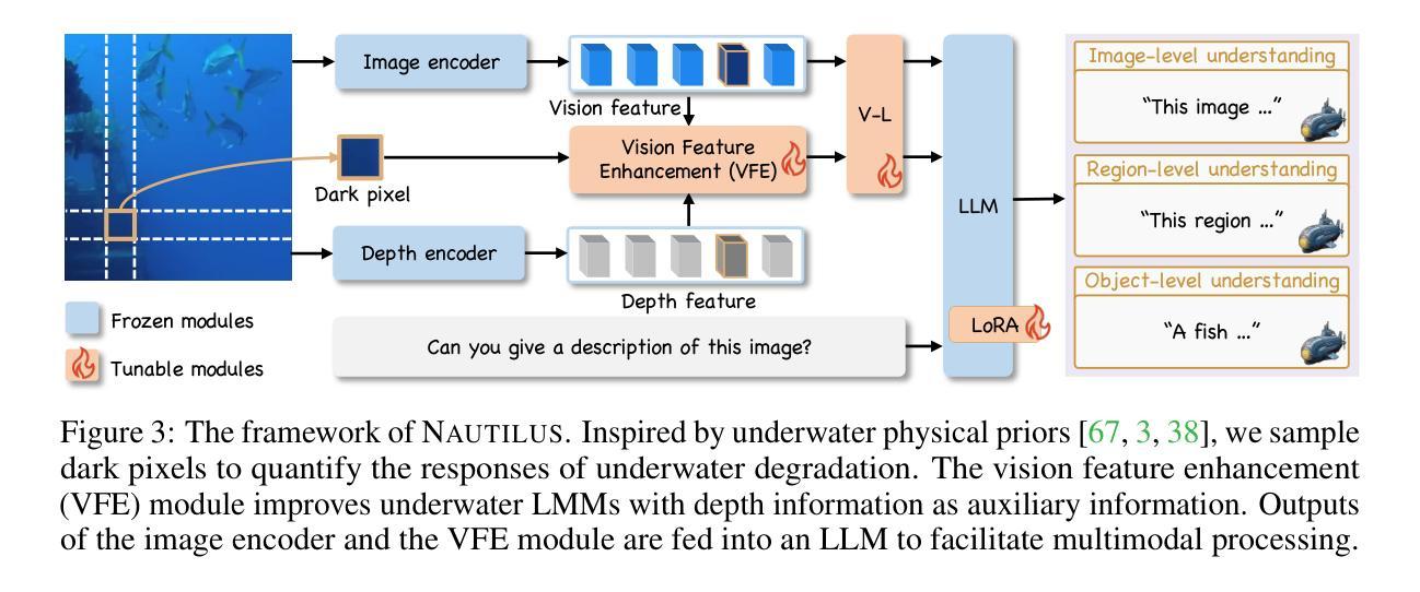 水下探索为我们的地球提供了关键见解,并因其资源探索、国家安全等领域的广泛应用而日益受到关注。我们研究水下场景理解方法,旨在实现自动化水下探索。水下场景理解任务需要来自多个粒度的多任务感知。然而,缺乏大规模的水下多任务指令调整数据集,阻碍了这项研究的进展。为了弥补这一空白,我们构建了NautData数据集,包含145万张图像文本对,支持水下场景理解的八个任务。它能够促进水下场景理解模型的开发和全面评估。水下图像退化是一个公认的挑战,会干扰水下任务。为了提高水下场景理解的稳健性,我们引入了来自水下成像模型的物理先验知识,并提出了一种即插即用的视觉特征增强(VFE)模块,该模块可以明确恢复清晰的水下信息。我们将该模块集成到著名的基线LLaVA-1.5和Qwen2.5-VL中,构建了我们的水下LLM模型NAUTILUS。在NautData和公共水下数据集上进行的实验验证了VFE模块的有效性,该模块在大多数支持的任务上均提高了基线模型的性能,从而确保了NAUTILUS在水下场景理解领域的优越性。数据和模型均可在https://github.com/H-EmbodVis/NAUTILUS获取。