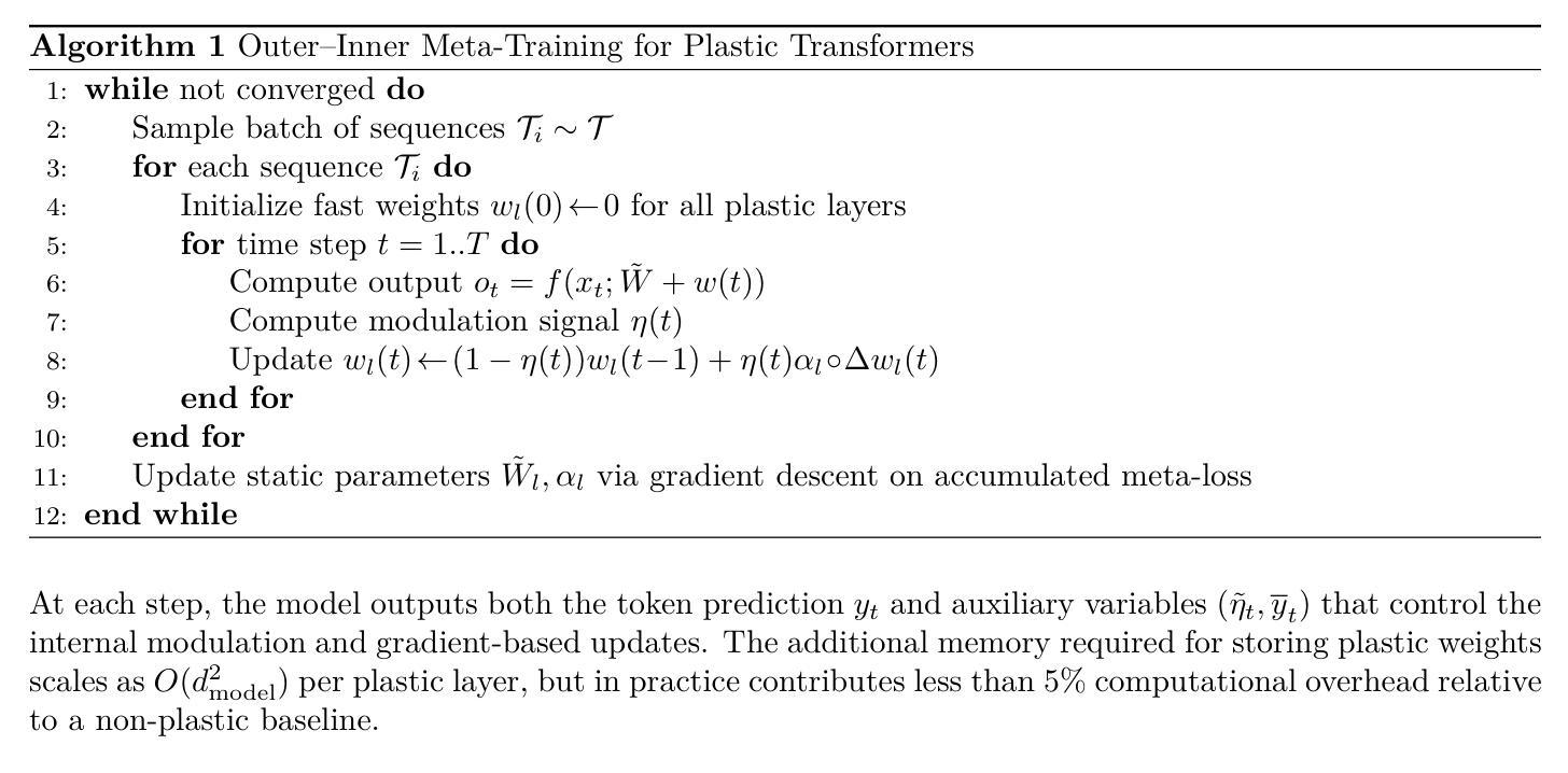 大型语言模型展现出上下文学习作为规模的一种涌现效应,但它们在推理过程中依赖于静态权重。与此相反,生物系统通过突触可塑性持续适应。我们调查明确的、受生物启发的可塑性是否可以赋予Transformer更快的序列适应性。为此,我们仅对解码器Transformer进行增强,通过(i)神经调节的赫布规则或(ii)段等人提出的基于梯度的可塑性机制进行快速权重模块更新(2023年)。在复制、回归和少镜头分类任务(CIFAR-FS、Omniglot)中,赫布可塑性始终实现更低的损失和更强的少镜头泛化能力,而基于梯度的更新在长期信用分配任务上表现最佳。当关联短暂且线性可分时,静态权重就足够了,这为可塑性何时有帮助设定了明确的边界条件。对学到的调制信号的分析表明,基于梯度的规则维持了大而持久的更新,而赫布可塑性则围绕显著事件进行尖锐的闸门控制。总的来说,这些结果表明,明确的可塑性通过实现快速、特定的任务适应来补充注意力,并明确了不同可塑性机制何时最为有效。