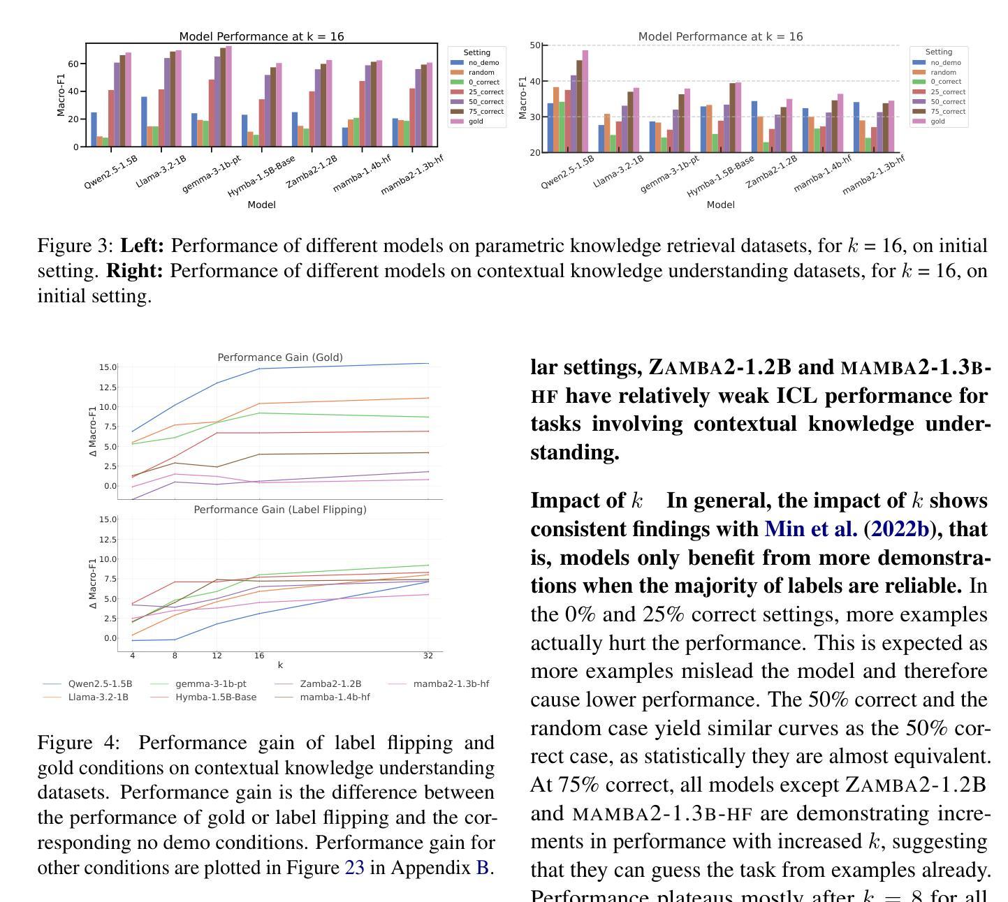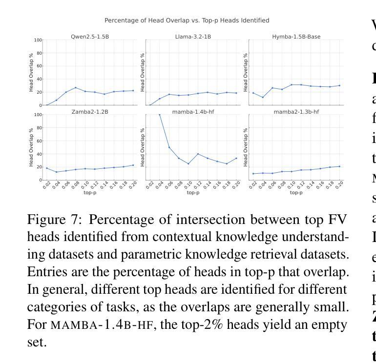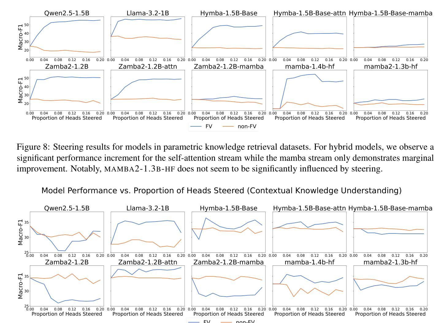 Summary:我们对不同架构的大型语言模型(LLM)在两类知识型上下文学习任务上进行了深入评估。结合行为探测和干预方法,我们发现虽然不同架构的LLM在任务性能上表现相似,但它们的内部结构可能不同。我们发现在自注意力层和Mamba层中存在主要负责上下文学习的功能向量(FVs),并推测Mamba2使用不同于FVs的机制进行上下文学习。功能向量对于涉及参数知识检索的上下文学习更为重要,但对于上下文知识理解则不那么重要。我们的工作对不同的架构和任务类型提供了更微妙的了解,并在方法论上强调了结合行为分析和机制分析调查LLM能力的重要性。