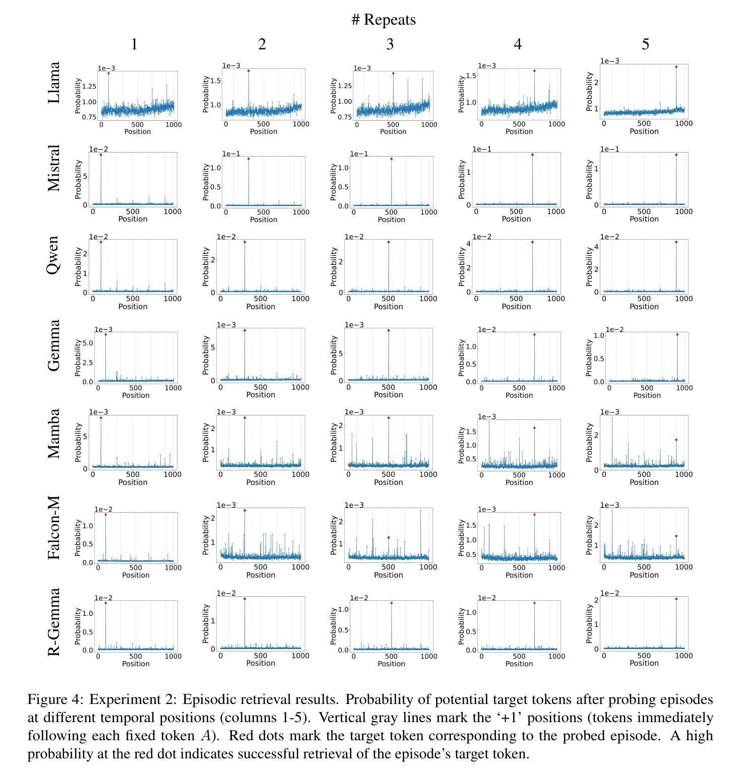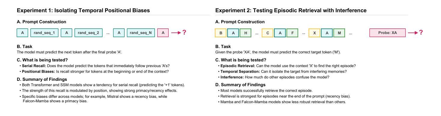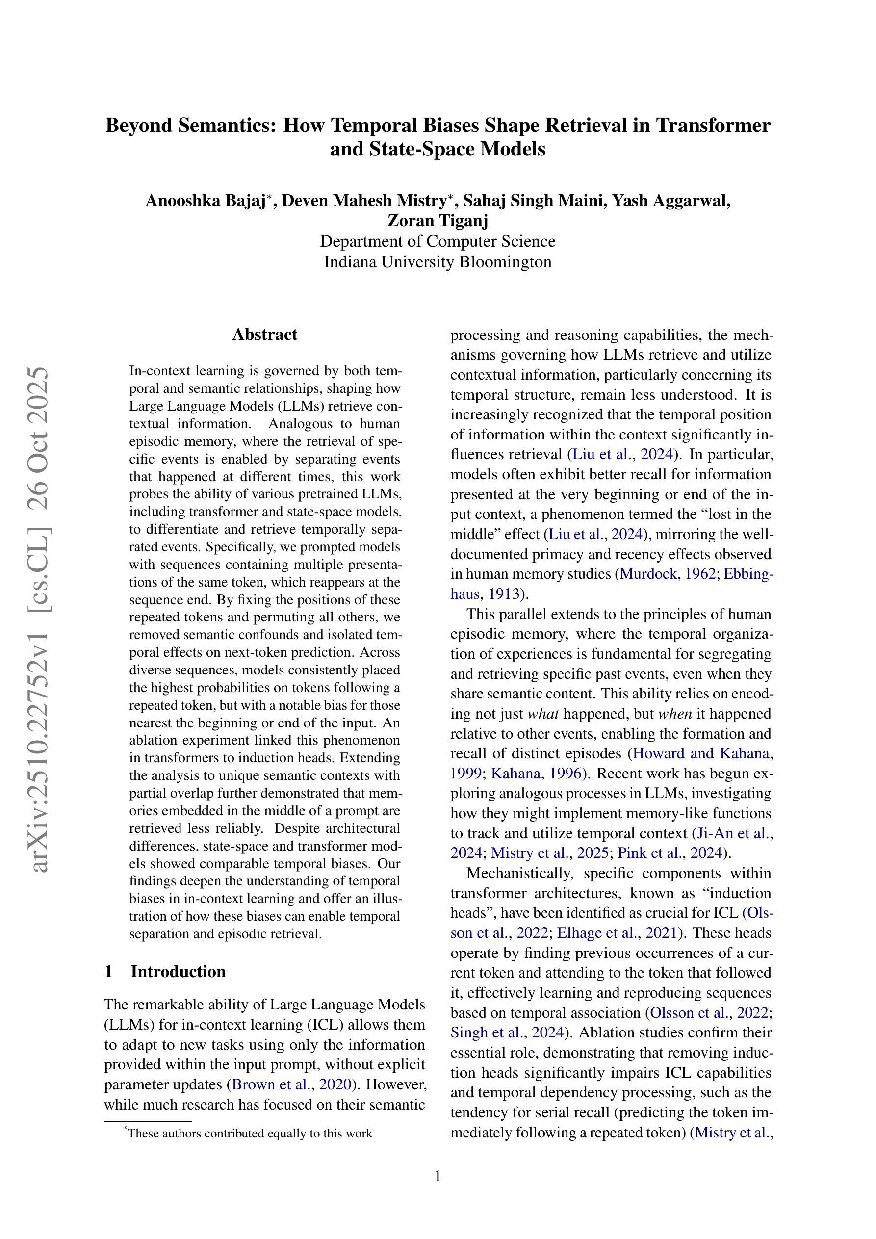 上下文学习受到时间和语义关系的影响,这决定了大型语言模型(LLM)如何检索上下文信息。这项工作探究了多种预训练的大型语言模型(包括transformer和状态空间模型)区分和检索时间上分离的事件的能力,与人类情景记忆类似,人类能够回忆特定事件的情景是因为能够区分发生在不同时间的事件。具体来说,我们通过设定包含多次出现相同标记的序列,并且该标记会在序列末尾再次出现,来提示模型。我们通过固定这些重复标记的位置并排列其他所有标记,消除了语义混淆,并隔离了对下一个标记预测的时间效应。在各种序列中,模型始终将最高概率分配给重复标记之后的标记,但对靠近输入开始或结束的标记有明显的偏向。一项消融实验显示,这种现象与transformer中的归纳头有关。将分析扩展到具有部分重叠的独特语义背景进一步表明,嵌入在提示中间的记忆检索可靠性较低。尽管架构存在差异,但状态空间模型和transformer模型显示出类似的时间偏见。我们的研究深化了对上下文学习中时间偏见的理解,并说明了这些偏见如何能够实现时间分离和情景检索。