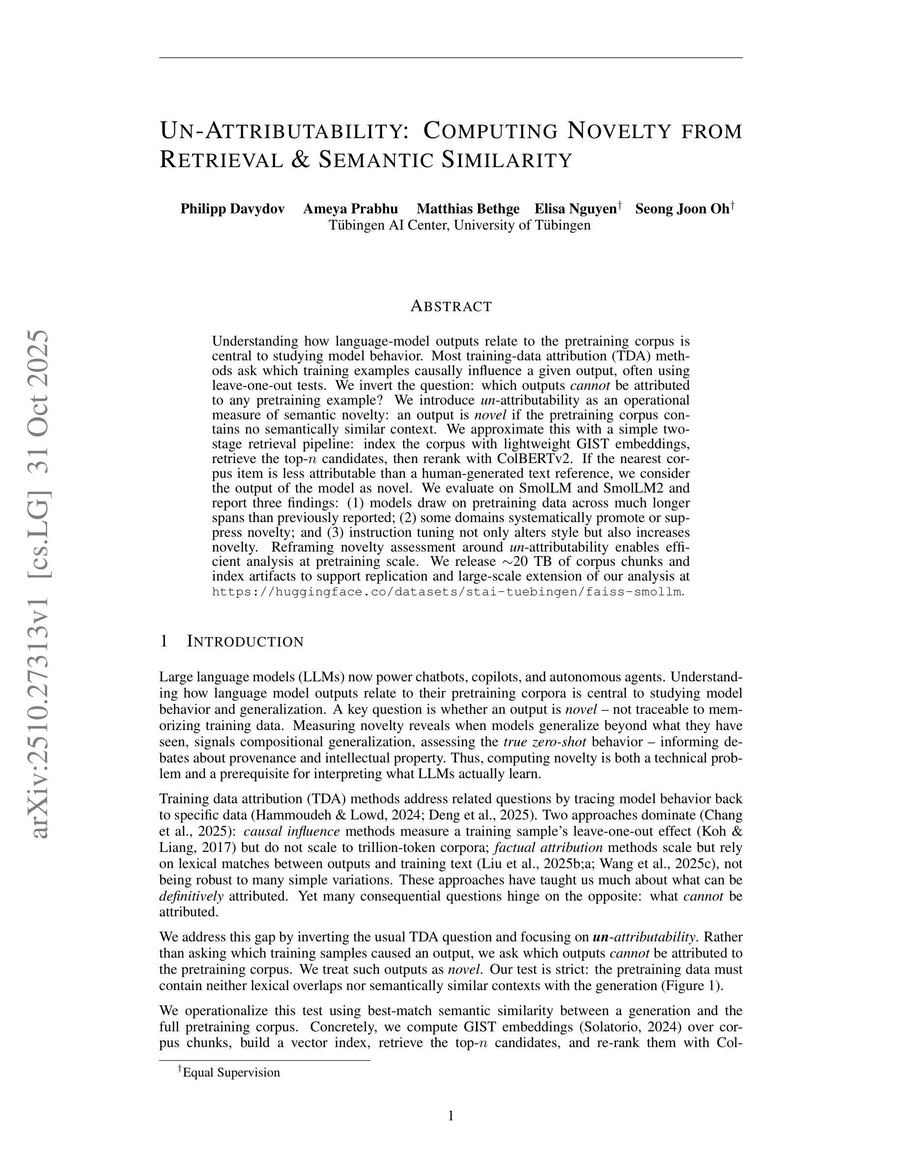 理解语言模型的输出与预训练语料库之间的关系是研究模型行为的核心。大多数训练数据归属(TDA)方法都是询问哪些训练样本对给定输出产生了因果影响,通常使用留一法测试。我们反过来提出问题:哪些输出不能归属于任何预训练样本?我们引入不可归属性作为语义新颖度的操作度量:如果预训练语料库中不存在语义上相似的上下文,则输出被视为新颖的。我们通过一个简单的两阶段检索流程来近似这一点:使用轻量级的GIST嵌入对语料库进行索引,检索前n个候选者,然后使用ColBERTv2进行重新排序。如果最近的语料库项比人工生成的文本参考样本的归属度低,我们认为模型的输出是新颖的。我们在SmolLM和SmolLM2上进行了评估,并报告了三个发现:(1)模型调用预训练数据的跨度比以前报道的要长得多;(2)某些领域会系统地促进或抑制新颖性;(3)指令调整不仅改变了风格,还增加了新颖性。以不可归属性重新构建新颖性评估,能够在预训练规模上进行高效分析。我们发布了约20TB的语料库片段和索引文物,以支持我们的分析复制和大规模扩展。详情请参阅https://huggingface.co/datasets/stai-tuebingen/faiss-smollm。