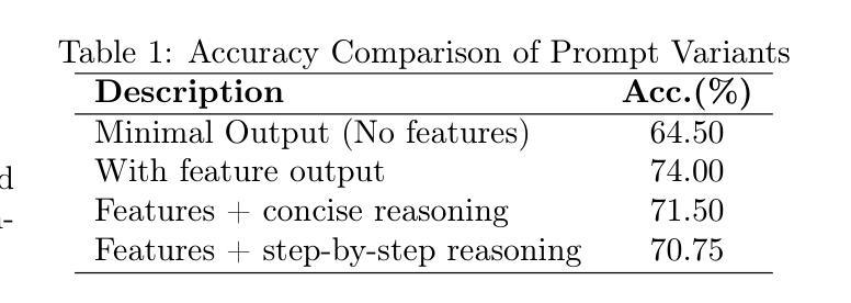 - 简洁、以特征为中心的提示获得了最高分类准确率(74%)。