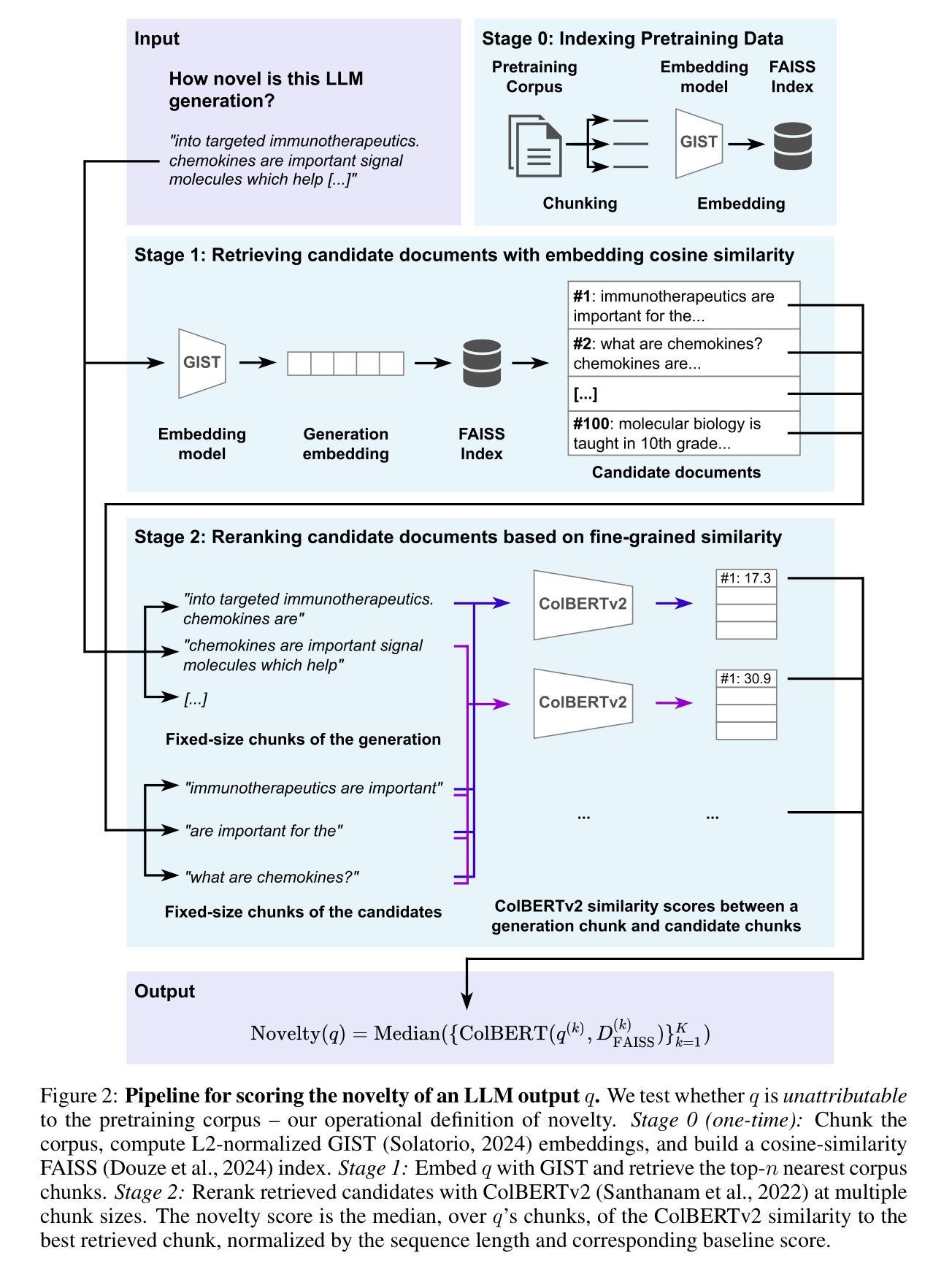 文本主要研究了语言模型输出与预训练语料库之间的关系,并提出了一个新的衡量标准——不可归因性,用于评估模型输出的语义新颖度。通过倒排索引和基于GIST嵌入的检索方法,发现模型在预训练数据上的依赖跨度比以往报道的要长得多。同时,一些领域会系统地促进或抑制新颖性,指令微调不仅改变风格,还增加新颖性。通过重新构建基于不可归因性的新颖性评估方法,可在预训练规模上实现高效分析。