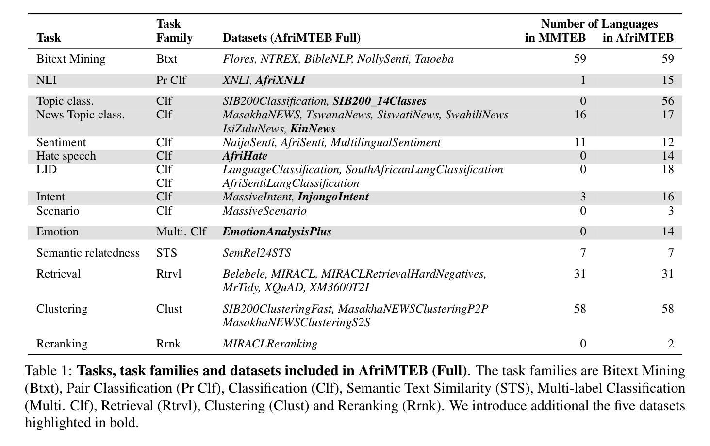 4.AfriMTEB是MMTEB的区域扩展版本,覆盖59种语言、14个任务和38个数据集,包括新添加的六个数据集。 - 与许多只包含少数语言的MMTEB数据集不同,新添加的数据集涵盖了多达56种非洲语言。