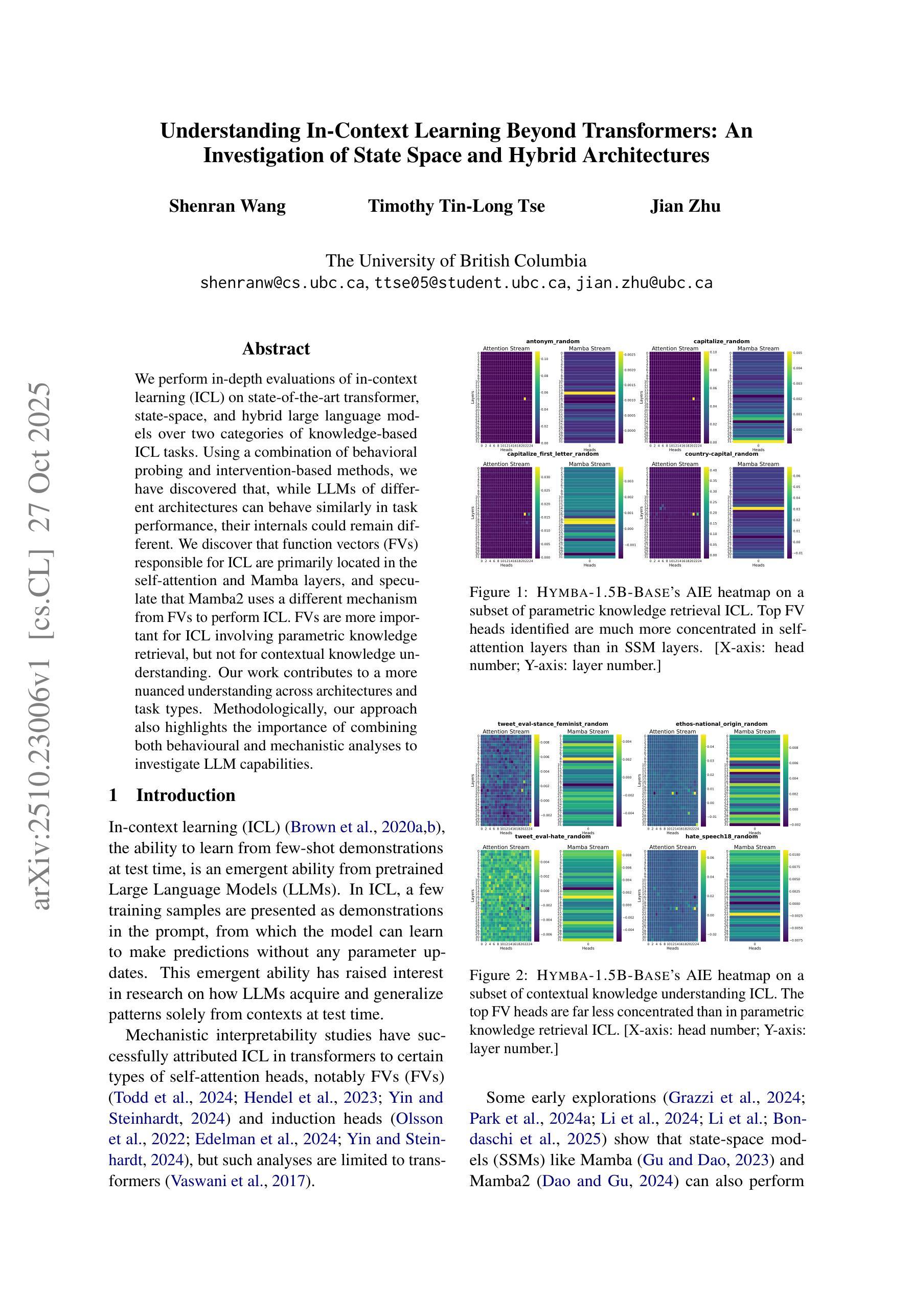 我们对最先进的转换器、状态空间和混合大型语言模型进行了两类基于知识的上下文学习(ICL)任务的深入评估。通过结合行为探测和基于干预的方法,我们发现虽然不同架构的大型语言模型在任务性能上可能表现相似,但它们的内部结构可能仍然存在差异。我们发现,负责ICL的功能向量(FV)主要位于自注意力和玛姆巴层,并推测玛姆巴2使用不同于FV的机制来执行ICL。FV对于涉及参数知识检索的ICL更为重要,但对于上下文知识理解则不是如此。我们的工作有助于更细致地了解不同架构和任务类型。在方法论上,我们的方法也强调了结合行为分析和机制分析来调查大型语言模型能力的重要性。