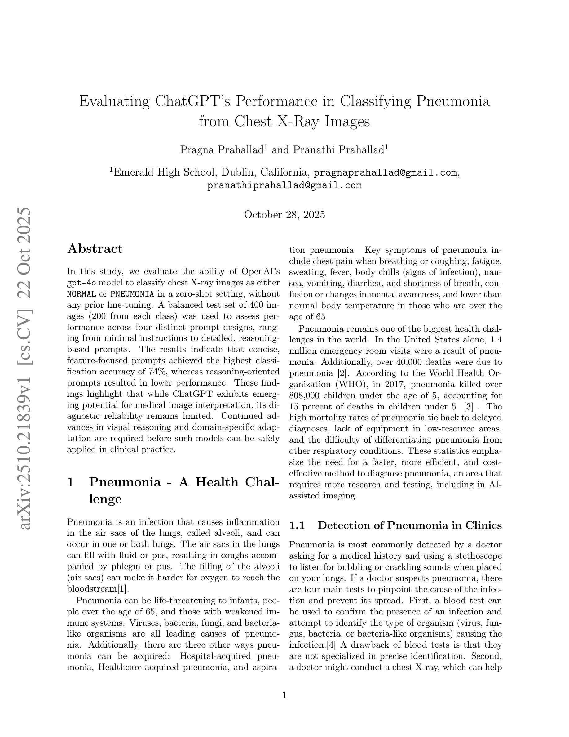 本研究评估了OpenAI的gpt-4o模型在零样本设置下对胸部X射线图像进行分类的能力,将其分为正常或肺炎两类,且无需进行任何先前的微调。使用包含400张图像(各200张)的平衡测试集来评估四种不同提示设计的性能,提示设计范围从简单的指令到详细、基于推理的提示。结果表明,简洁、以特征为中心的提示获得了最高的分类准确率(即74%),而基于推理的提示则导致性能下降。这些发现表明,虽然ChatGPT在医学图像解释方面显示出新兴潜力,但其诊断可靠性仍然有限。在将这种模型安全应用于临床实践之前,还需要在视觉推理和特定领域的适应性方面进行持续进步。