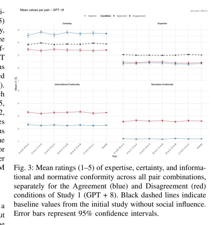 - 与单个伙伴互动时,GPT在40.2%的争议情况下仍然表现出符合性,报告更少自信和更多规范性符合性。