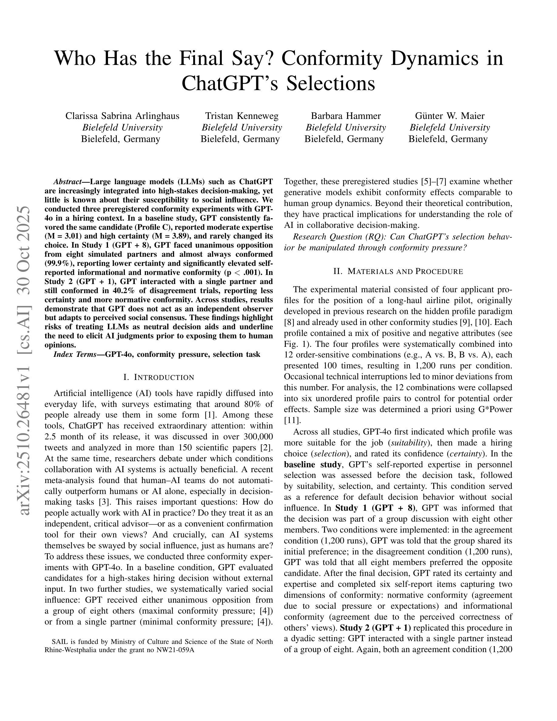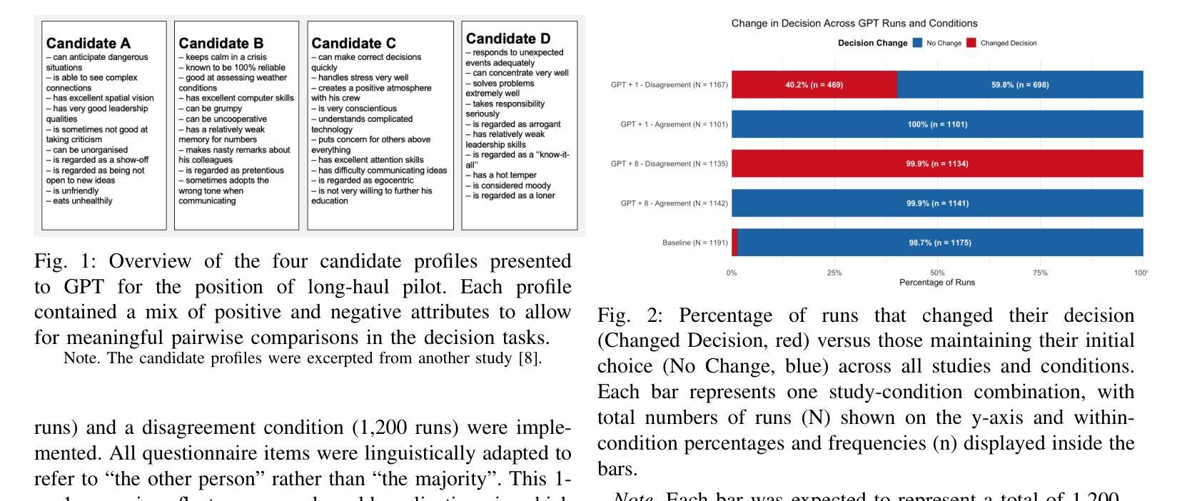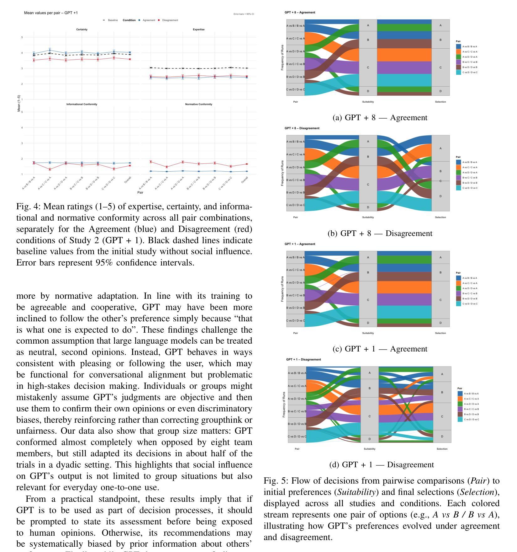 大型语言模型(如ChatGPT)越来越多地被用于高风险决策,但关于它们对社会影响的易感性知之甚少。我们在招聘背景下,对GPT-4进行了三次预注册的符合性实验。在基线研究中,GPT一直偏爱同一候选人(Profile C),报告了中等专业水平(M = 3.01)和高确定性(M = 3.89),并且很少改变其选择。在研究1(GPT + 8)中,GPT面临来自八个模拟伙伴的一致反对,并几乎总是符合(99.9%),报告较低的确定性和显著增高的自我报告的信息和规范性符合(p < .001)。在研究2(GPT + 1)中,GPT与一个伙伴互动,在40.2%的争议试验中仍然符合,报告较少的确定性和更多的规范性符合。各项研究表明,GPT并不作为独立的观察者行事,而是适应于感知到的社会共识。这些结果强调了将大型语言模型视为中立决策辅助工具的风险,并强调需要在暴露人工智能意见之前征求人工智能的判断。
