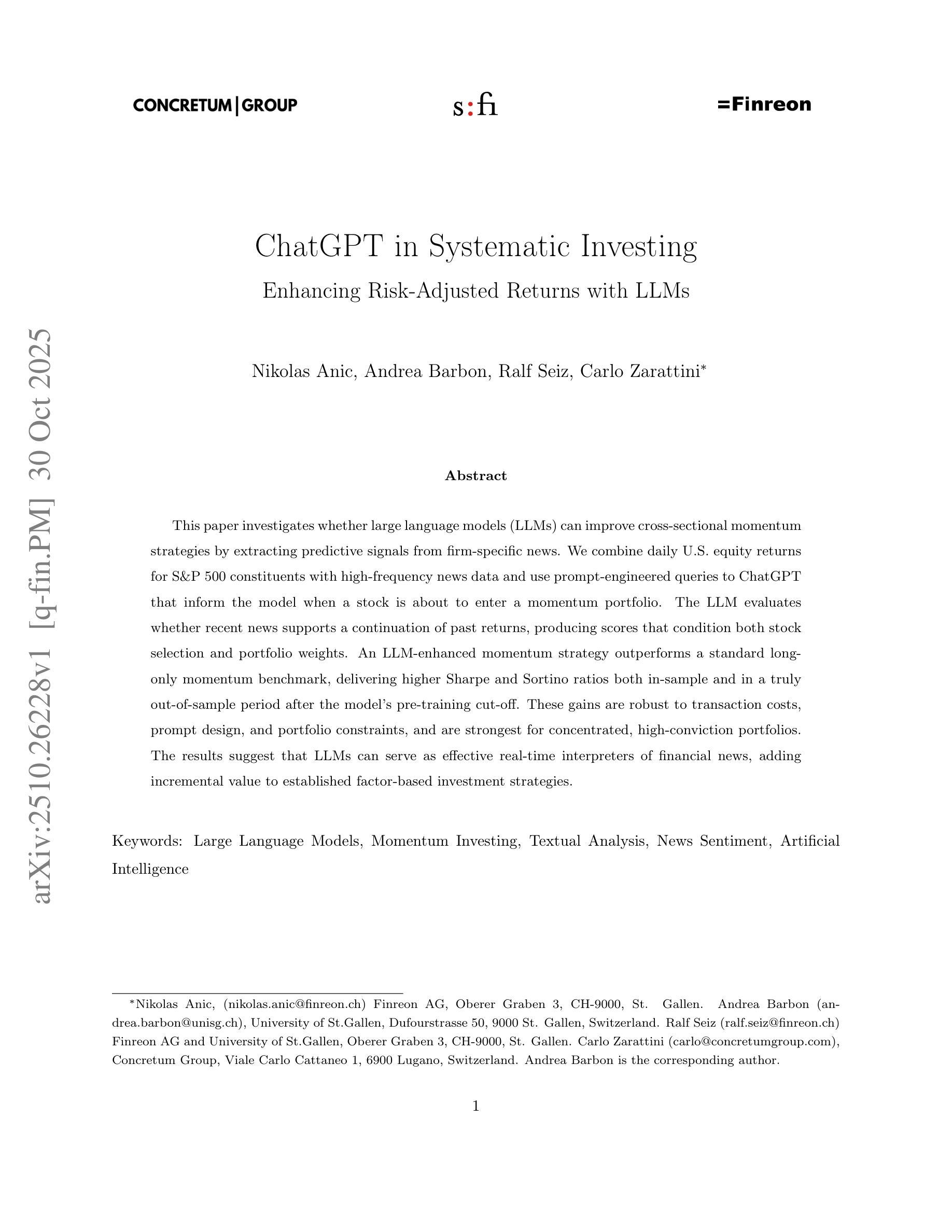 本文调查大型语言模型(LLM)是否可以通过从特定公司的新闻中提取预测信号来提高横截面动量策略。我们结合了标准普尔500成分股的每日美国股票回报与高频新闻数据,并使用针对ChatGPT设计的提示查询来告知模型何时将股票纳入动量投资组合。LLM评估最新新闻是否支持过去收益的持续,产生分数来决定股票选择和投资组合权重。增强型LLM动量策略优于标准的长仓动量基准,在样本内和模型预训练截止后真正的样本外期间均表现出更高的夏普比率和索提诺比率。这些收益在交易成本、提示设计和投资组合约束方面都很稳健,并且在集中、高信仰投资组合中表现最为强劲。结果表明,LLM可以作为金融新闻的有效实时解释器,为基于因素的投资策略增加增值。