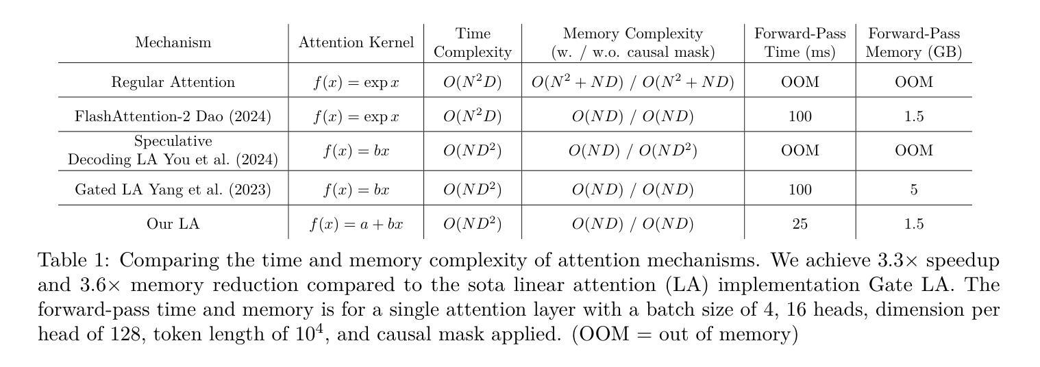 原始的基于softmax的注意力机制(常规注意力)在极其成功的Transformer架构中计算了N个标记之间的注意力,每个标记嵌入在D维头中,时间复杂度为O(N^2D)。鉴于Transformer的成功,提高其在训练和推理期间的运行时间是当前热门的研究领域。一种方法是引入线性注意力(LA)机制,它提供线性时间复杂度O(ND^2),并已证明其精度与常规注意力相当。然而,LA在实践中的效率并没有达到其理论效率。我们提出了一种用于LA前向和反向传递的新方法,以及高度优化的CUDA实现。我们的方法在速度上比现有技术高出3.3倍,并将内存消耗减少了3.6倍。我们通过训练包含1.4亿参数的单一语言模型验证了这些改进情况,该模型在主要推理基准测试中显示出与常规注意力相似的表达能力。