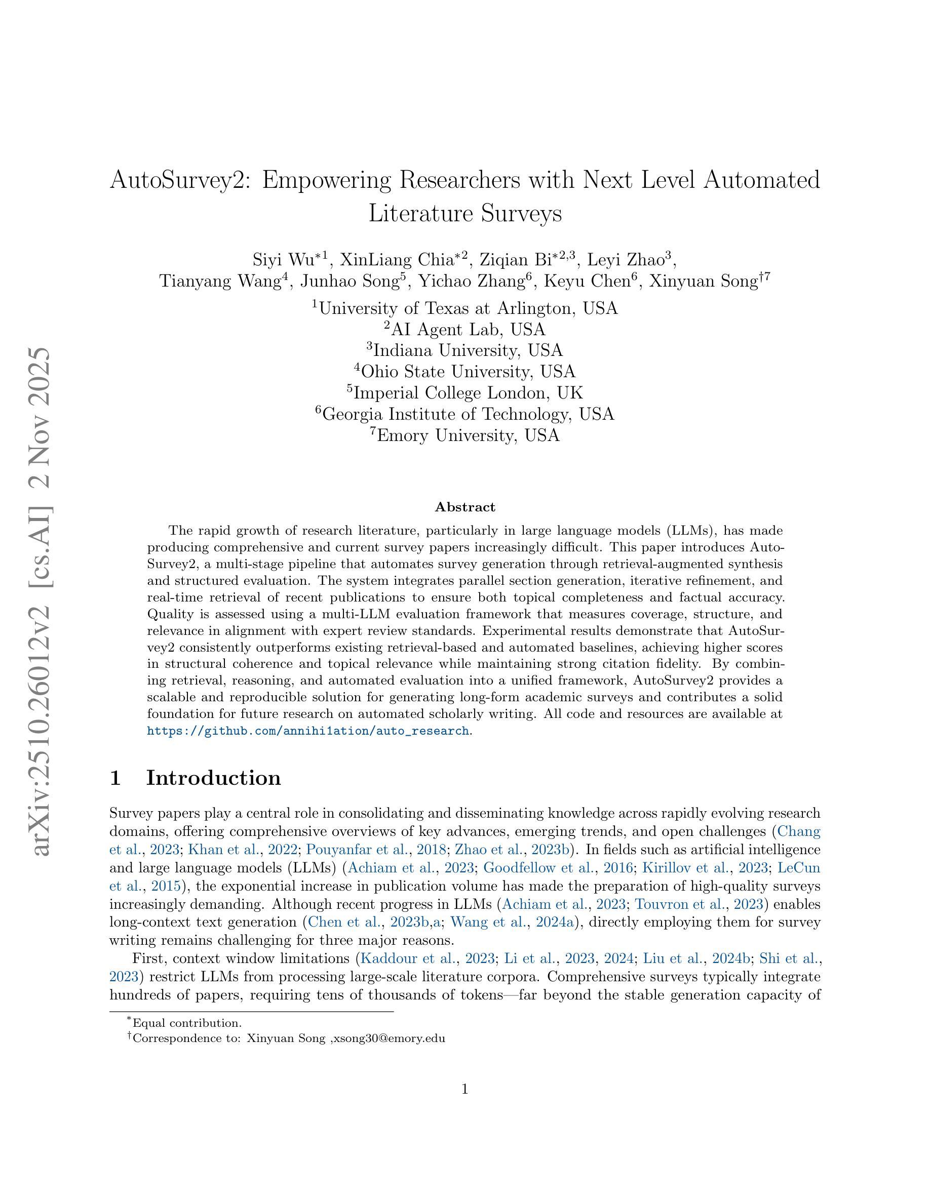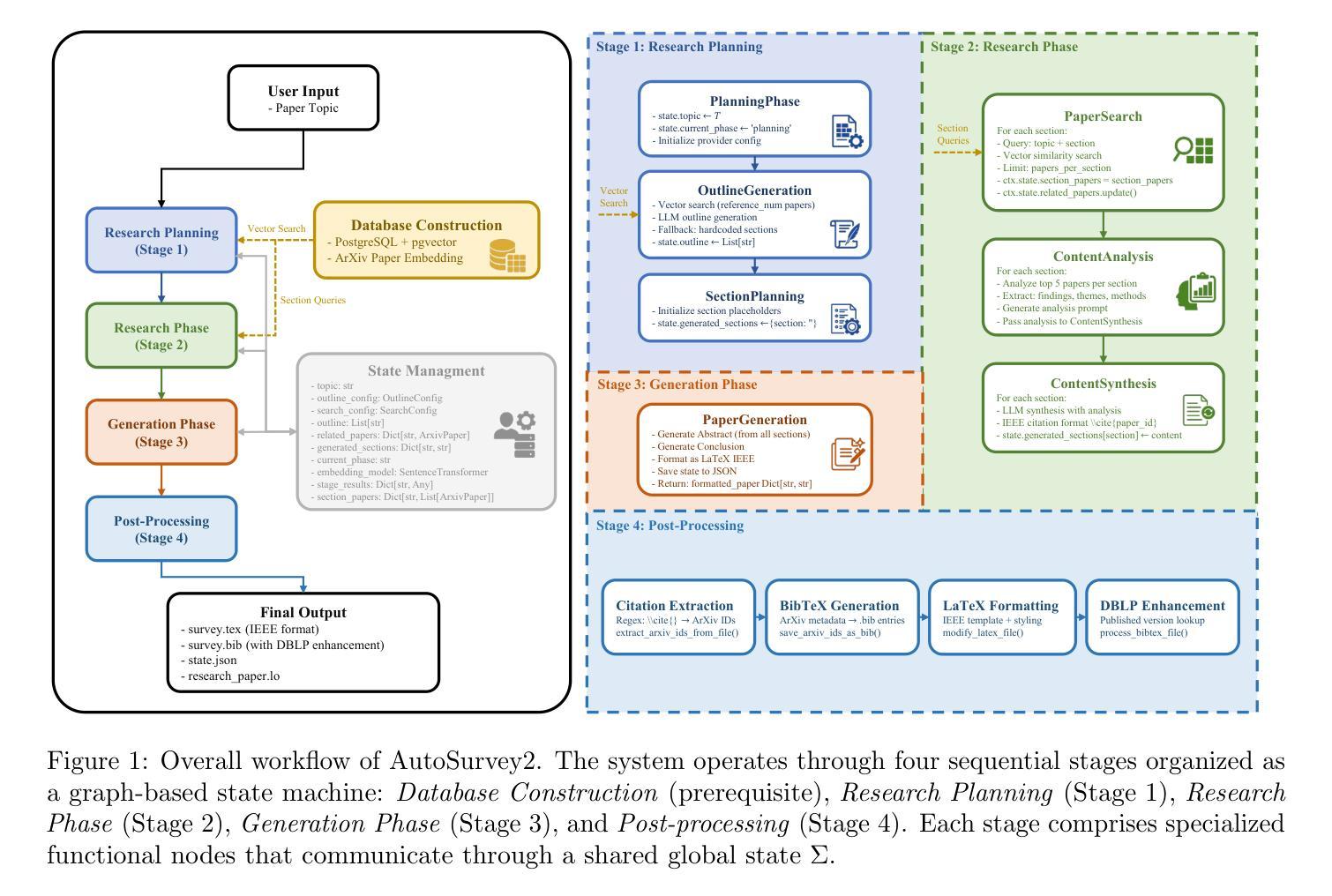 随着研究文献的快速增长,特别是在大型语言模型(LLMs)领域,撰写全面且最新的综述论文变得越来越困难。本文介绍了autosurvey2,这是一个多阶段的管道,通过增强检索的综合方法和结构化评估来自动化综述生成。该系统结合了并行段落生成、迭代细化和实时检索最新出版物,以确保主题完整性和事实准确性。质量评估采用多LLM评估框架,根据专家评审标准衡量覆盖率、结构和相关性。实验结果表明,autosurvey2持续优于现有的基于检索和自动化的基准测试,在结构连贯性和主题相关性方面得分更高,同时保持高引用保真度。通过将检索、推理和自动评估结合到一个统一框架中,autosurvey2为生成长格式的学术综述提供了一个可扩展和可复制的解决方案,并为未来自动化学术写作的研究奠定了坚实基础。所有代码和资源都可在https://github.com/annihi1ation/auto_research找到。