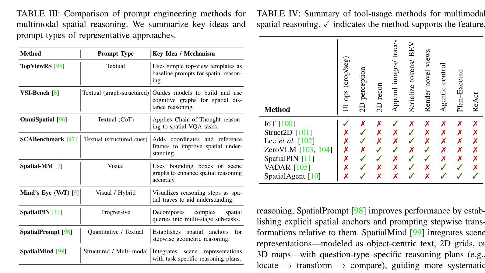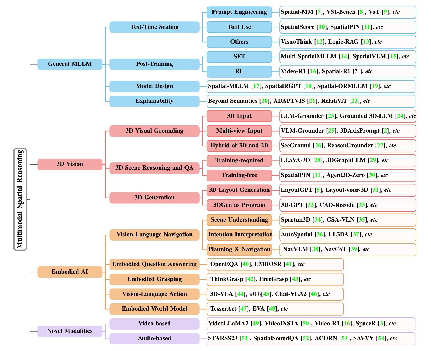- 大型多模态推理模型通过学习和感知扩展这些能力,在各种空间任务中表现优异。