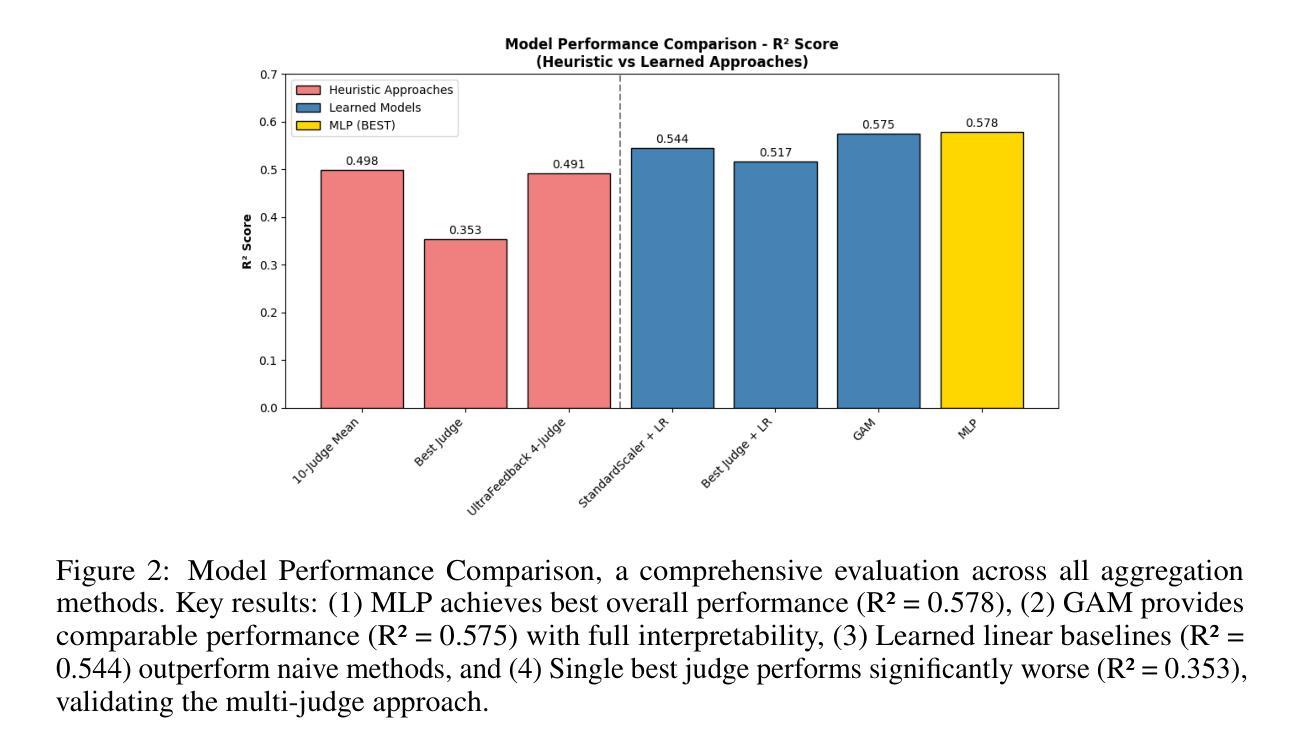 将基于LLM的裁判与人类偏好对齐是一项重大挑战,因为它们难以校准,且经常受到评分标准敏感性、偏见和不稳定性的影响。克服这一挑战有助于推动关键应用的发展,例如建立可靠的奖励模型用于人类反馈强化学习(RLHF),以及构建有效的路由系统来为给定用户查询选择最合适的模型。在这项工作中,我们提出了一个通过学习聚合多个评分标准条件下的裁判输出来建模多样化和个性化偏好的框架。我们研究了该方法相对于简单基准线的性能,并通过关于人类和LLM裁判偏见的案例研究来评估其稳健性。我们的主要贡献包括一种基于个性化的大规模偏好标签合成方法,以及我们聚合器的两种不同实现:广义可加模型(GAM)和多层感知器(MLP)。