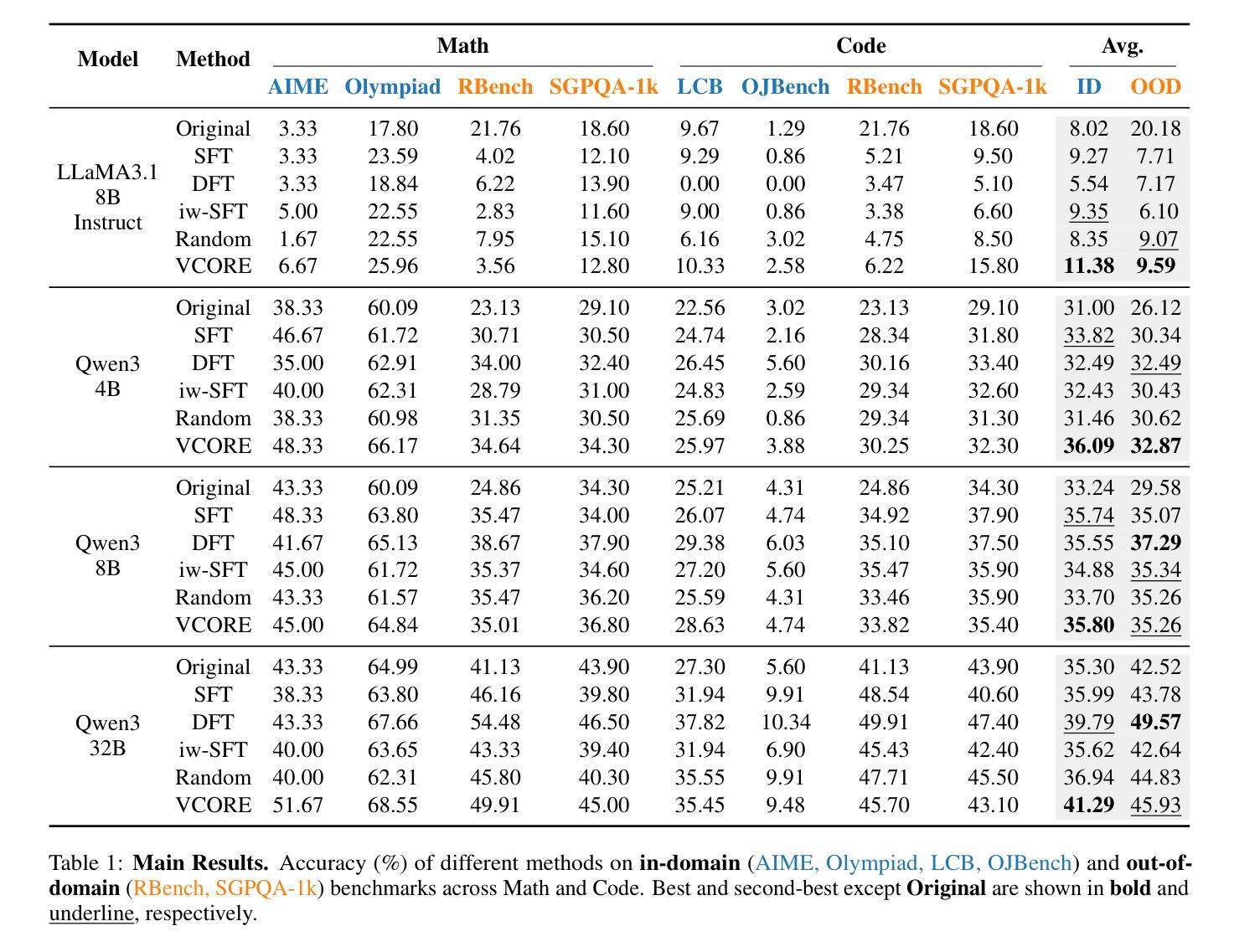 - VCORE框架在多种数学和编码基准测试中表现优异,且适用于不同规模和领域的大型语言模型。