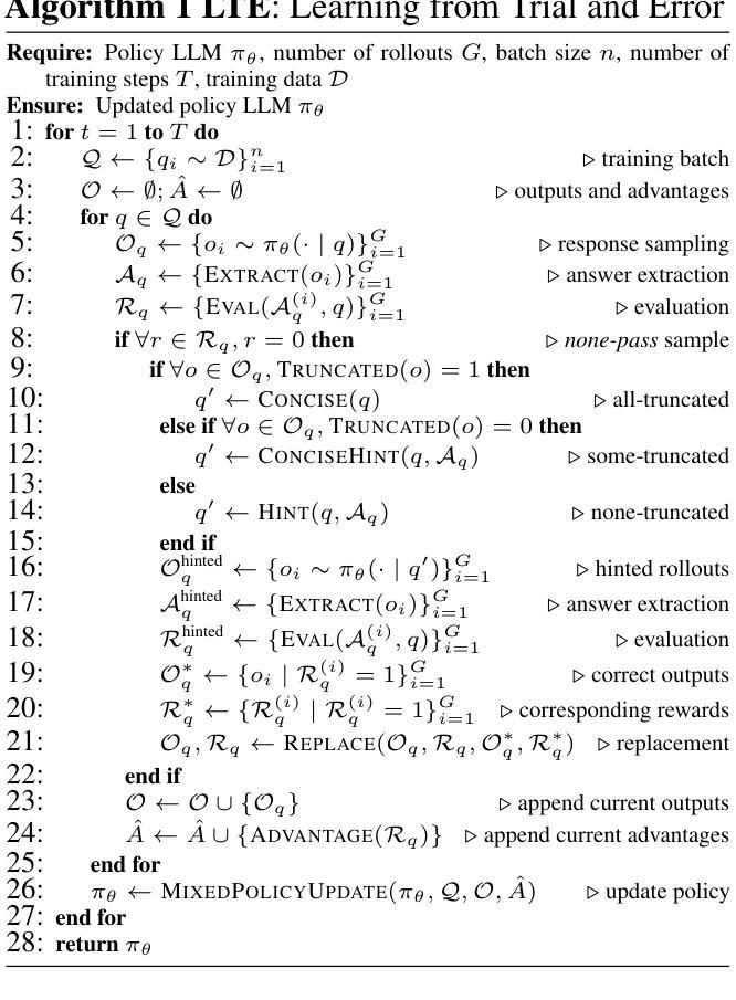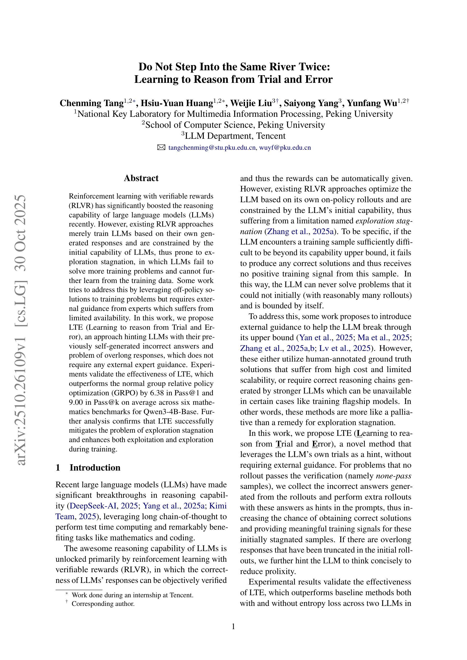 强化学习与可验证奖励(RLVR)最近极大地提升了大型语言模型(LLM)的推理能力。然而,现有的RLVR方法仅基于LLM自身生成的响应进行训练,并受到LLM初始能力的限制,容易出现探索停滞问题,即LLM无法解决更多的训练问题,无法从训练数据中进一步学习。为解决这一问题,一些研究尝试利用非策略解决方案,但需要专家外部指导,存在指导有限的问题。本研究提出了LTE(从试错中学习推理)方法,该方法通过提示LLM之前自我生成的错误答案和过长响应的问题,无需任何外部专家指导。实验验证了LTE的有效性,在六个数学基准测试上,相对于常规群组相对策略优化(GRPO),LTE在Pass@1和Pass@k上的平均表现分别提高了6.38和9.00。进一步分析表明,LTE成功缓解了探索停滞问题,并在训练过程中提高了开发和探索能力。