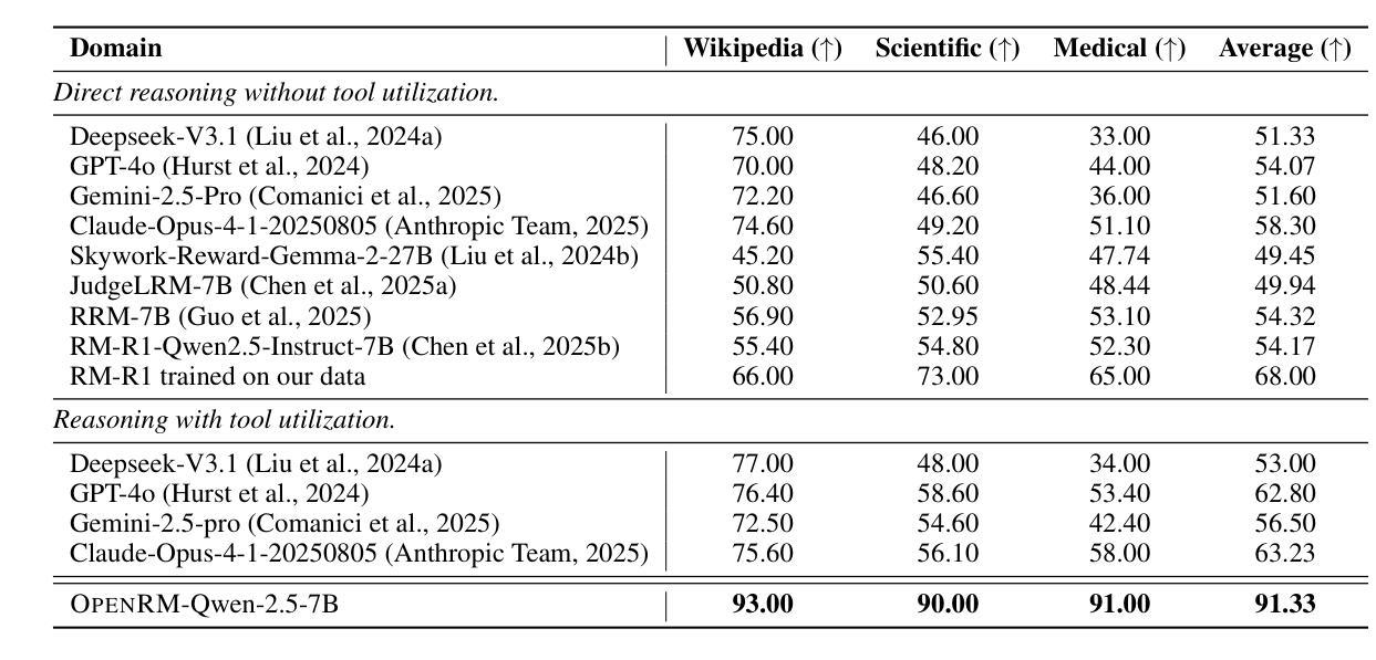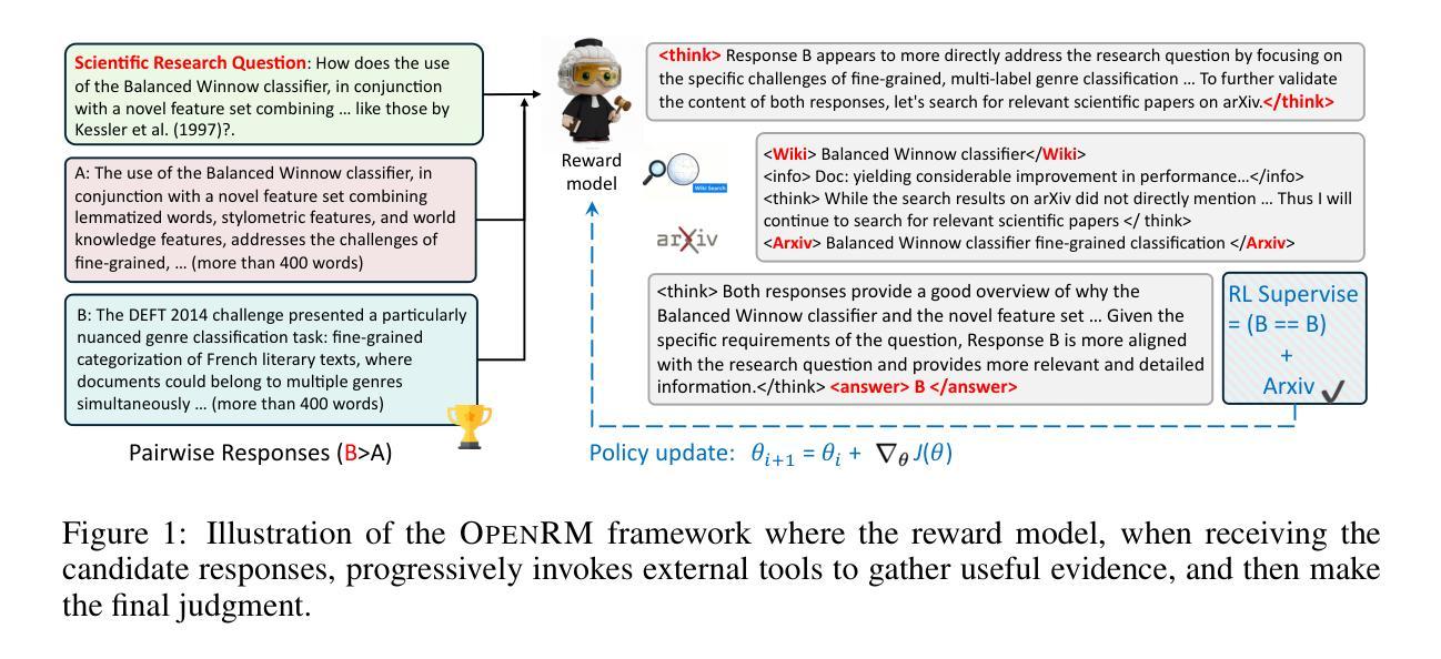 一篇关于奖励模型(RMs)的论文指出,RMs在大规模语言模型(LLMs)的应用中已成为关键,作为人类评估的可扩展代理,用于训练和推理。然而,现有RMs在知识密集型和长格式任务上表现不佳,这些任务需要超越模型内部知识的评估正确性。为解决这一问题,论文提出了OpenRM,一个通过调用外部工具来系统地评估开放式响应的工具增强型长格式奖励模型。通过Group Relative Policy Optimization(GRPO)在超过2.7万个合成对示例上进行训练,这些示例通过一个可控的数据合成框架生成。培训目标联合监督中间工具使用和最终结果的准确性,激励奖励模型学习有效的基于证据的判断策略。在三个新收集的数据集和两个广泛使用的基准测试上的大量实验表明,OpenRM显著优于现有的奖励建模方法。作为进一步的研究方向,论文将OpenRM集成到推理时间响应选择和训练时间数据选择中,为下游LLM对齐任务带来了一致的收益,突显了工具增强奖励模型在可靠长格式评估方面的潜力。