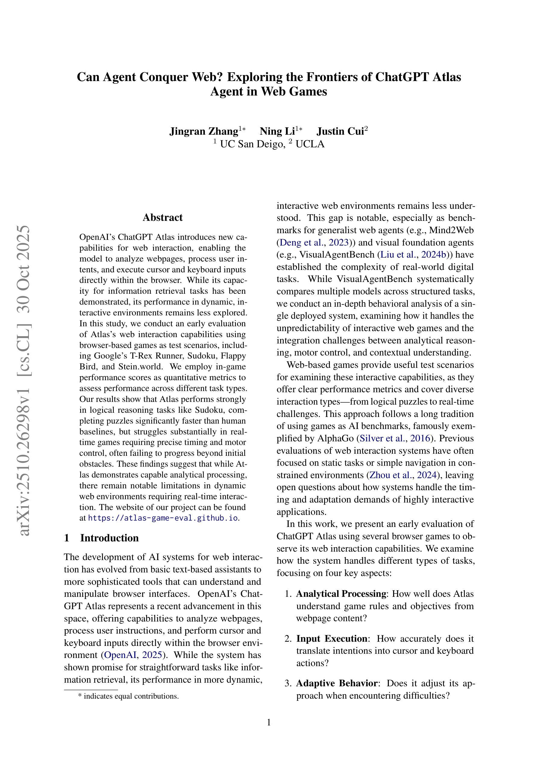 OpenAI的ChatGPT Atlas引入了网页交互的新功能,使模型能够分析网页、处理用户意图,并在浏览器内直接执行光标和键盘输入。虽然其在信息检索任务方面的能力已经得到证明,但在动态、交互式环境中的表现仍然研究较少。本研究通过基于浏览器的游戏测试场景对Atlas的网页交互能力进行了初步评估,包括Google的T-Rex Runner、数独、飞翔鸟和Stein.world。我们采用游戏内绩效得分作为定量指标,评估不同任务类型的性能。结果表明,Atlas在逻辑推理任务(如数独)中表现强劲,完成谜题的速度明显快于人类基准线,但在需要精确计时和动作控制的实时游戏中遇到困难,往往无法克服初始障碍。这些发现表明,虽然Atlas表现出了强大的分析能力,但在需要实时交互的动态网页环境中仍存在明显的局限性。我们项目的网站可在 https://atlas-game-eval.github.io 找到。