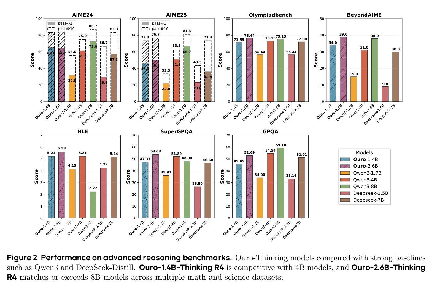- Ouro 1.4B和2.6B模型性能优越,与SOTA LLM相当。