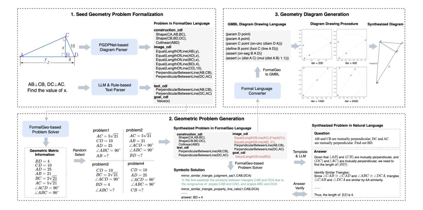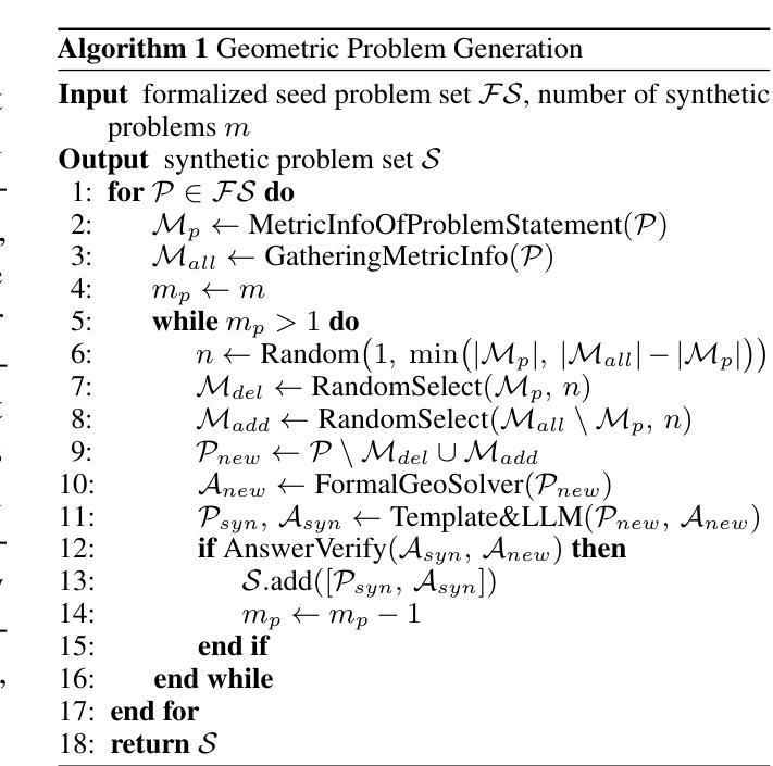 多模态大型语言模型(MLLMs)在学术和业界中都受到了极大的关注,因为它们能够处理多模态任务。然而,这些模型在数学几何推理方面面临着挑战,主要是由于高质量几何数据的稀缺。为了解决这个问题,合成几何数据已经成为一种重要的策略。当前生成合成几何数据的方法包括重新表述或扩展现有问题,以及利用预先定义的规则和模板来创建几何图像和问题。然而,这些方法常常产生的数据缺乏多样性或容易引入噪声。此外,现有方法合成的几何图像往往变化有限,与真实的几何图表存在显著差异。为了克服这些局限性,我们提出了GeoFM,一种合成几何数据的新方法。GeoFM使用形式语言来探索度量空间内的条件组合,生成与原始问题不同的高保真几何问题,并通过符号引擎确保正确性。实验结果表明,我们的合成数据在多个方面显著优于现有方法。使用我们数据的模型在MathVista的几何问题解决任务上超越了专有GPT-4o模型,提高了18.7%,在GeoQA上提高了16.5%。此外,它还超过了一个领先的开源模型在MathVista上的性能提高了5.7%,在GeoQA上的性能提高了2.7%。