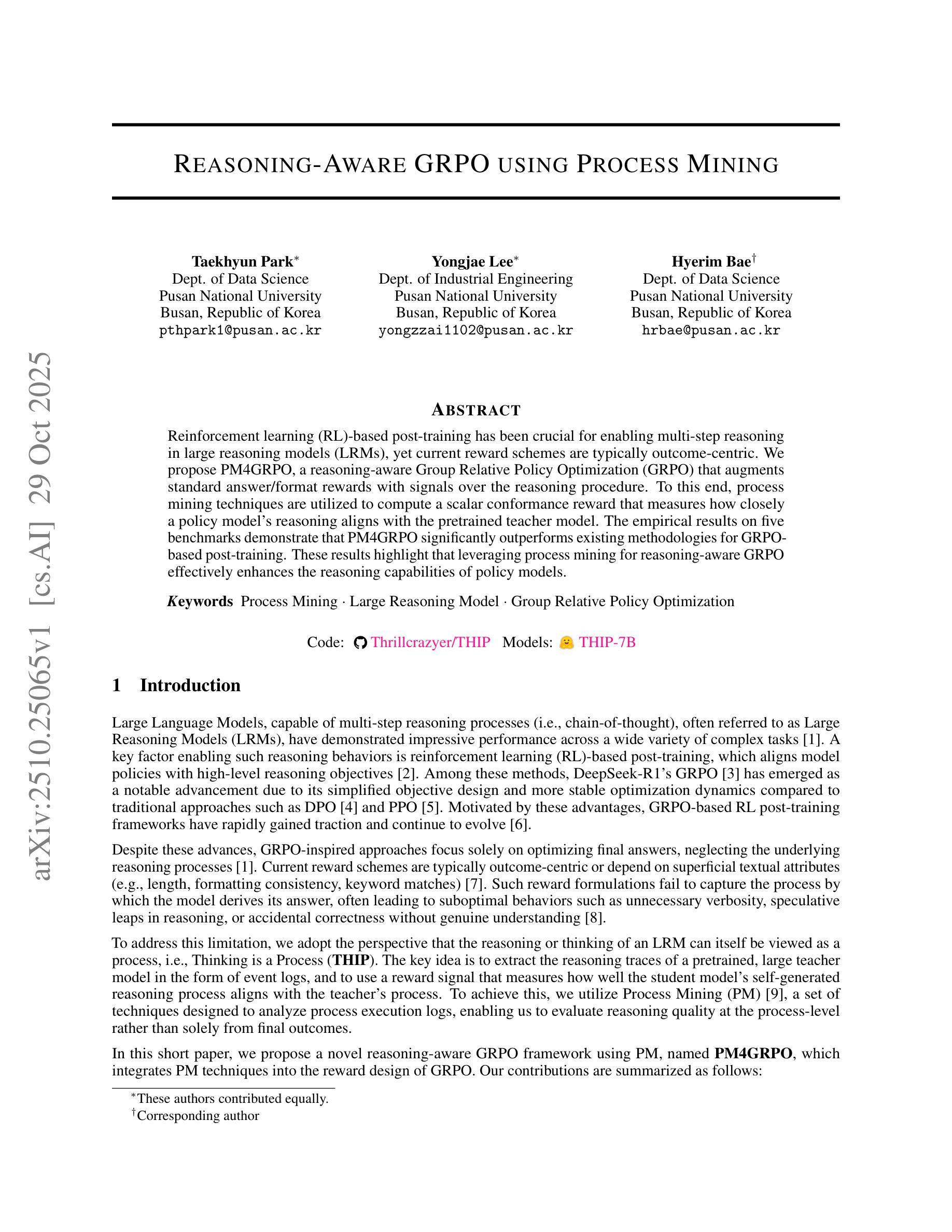 Reinforcement learning (RL)-based post-training has been crucial for enabling multi-step reasoning in large reasoning models (LRMs), yet current reward schemes are typically outcome-centric. We propose PM4GRPO, a reasoning-aware Group Relative Policy Optimization (GRPO) that augments standard answer/format rewards with signals over the reasoning procedure. To this end, process mining techniques are utilized to compute a scalar conformance reward that measures how closely a policy model’s reasoning aligns with the pretrained teacher model. The empirical results on five benchmarks demonstrate that PM4GRPO significantly outperforms existing methodologies for GRPO-based post-training. These results highlight that leveraging process mining for reasoning-aware GRPO effectively enhances the reasoning capabilities of policy models.