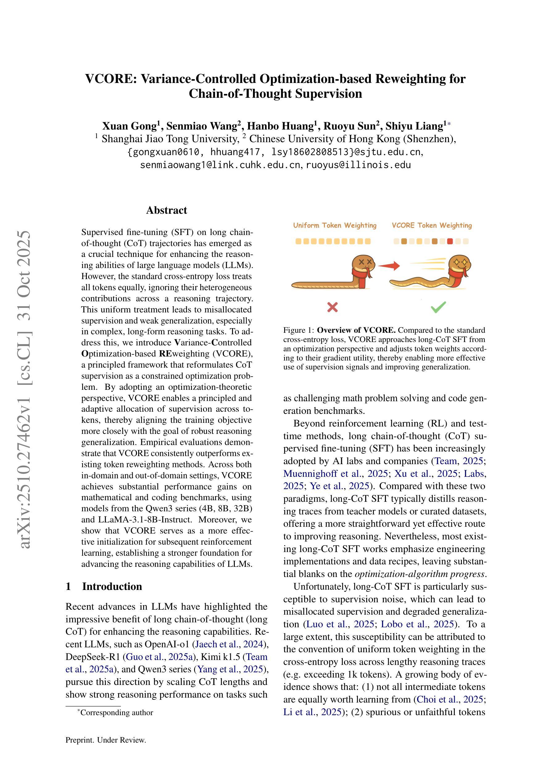 本文介绍了针对大型语言模型(LLM)的精细监督调整(SFT)技术,特别是在长链思维(CoT)轨迹上的应用。然而,标准交叉熵损失平等对待所有标记,忽略了它们在推理轨迹中的不同贡献,导致监督分配不当和泛化能力弱。为解决这一问题,本文提出了基于优化理论的方差控制优化重加权(VCORE)框架,将CoT监督重新定义为约束优化问题。通过优化理论视角,VCORE实现了对标记的灵活且有针对性的监督分配,更好地符合了推理泛化的目标。经验评估显示,VCORE在多种数学和编码基准测试中表现优异,适用于不同领域和模型规模的大型语言模型。此外,VCORE还为后续的强化学习提供了更有效的初始化。代码将在GitHub上公开。