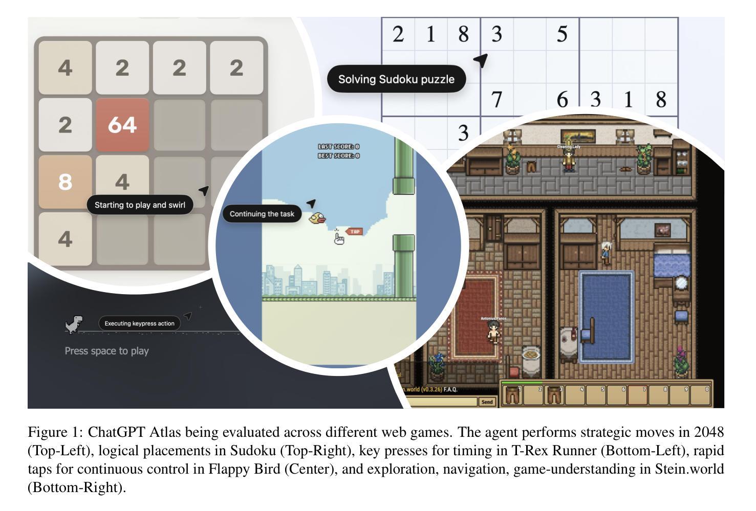 OpenAI的ChatGPT Atlas通过网页交互能力实现了在浏览器内的直接分析与操作。本研究通过浏览器游戏测试其性能,发现Atlas在逻辑推理任务上表现优异,但在需要实时互动和精确控制的游戏中表现欠佳。