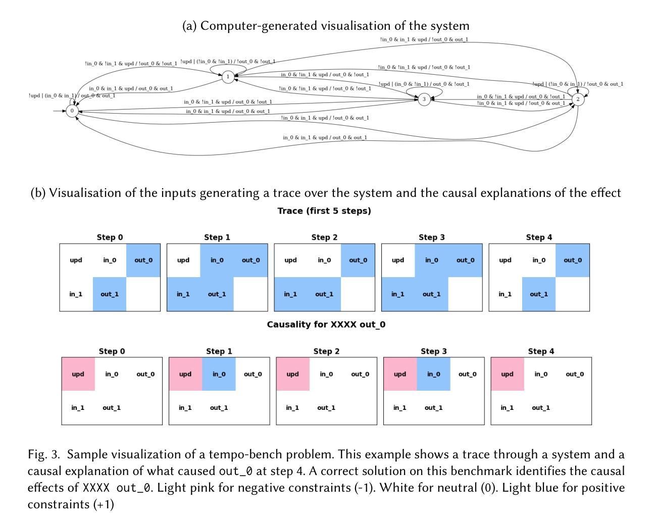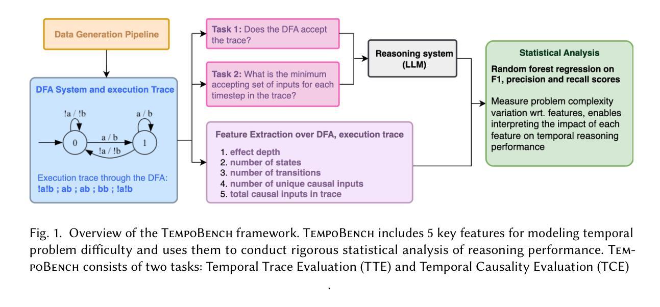 大型语言模型(LLM)在许多任务上超越了人类的表现,但为了提高其推理能力,研究者们依赖于特定情境生成的数据集或形式化数学证明系统,如Lean证明助手。特定情境生成的方法能够捕捉现实世界的决策过程,但可能引入一些意外的偏见;而形式化系统虽然可以验证,但不擅长捕捉基于代理的决策链任务。因此,存在业务代理或代码助手等功能的性能差距,以及LLM推理基准测试的实用性和结构合理性上的不足。我们引入了TempoBench,这是一个形式化且可验证的诊断基准测试,可以参数化难度,以系统地分析LLM的推理能力。它通过两个评估基准,即时间轨迹评估(TTE)和时间因果评估(TCE),来测试LLM的推理能力。结果显示,模型在TCE正常任务上的得分为65.6%,在困难任务上的得分为7.5%,表明随着系统复杂性的增加,LLM的理解能力有所下降。