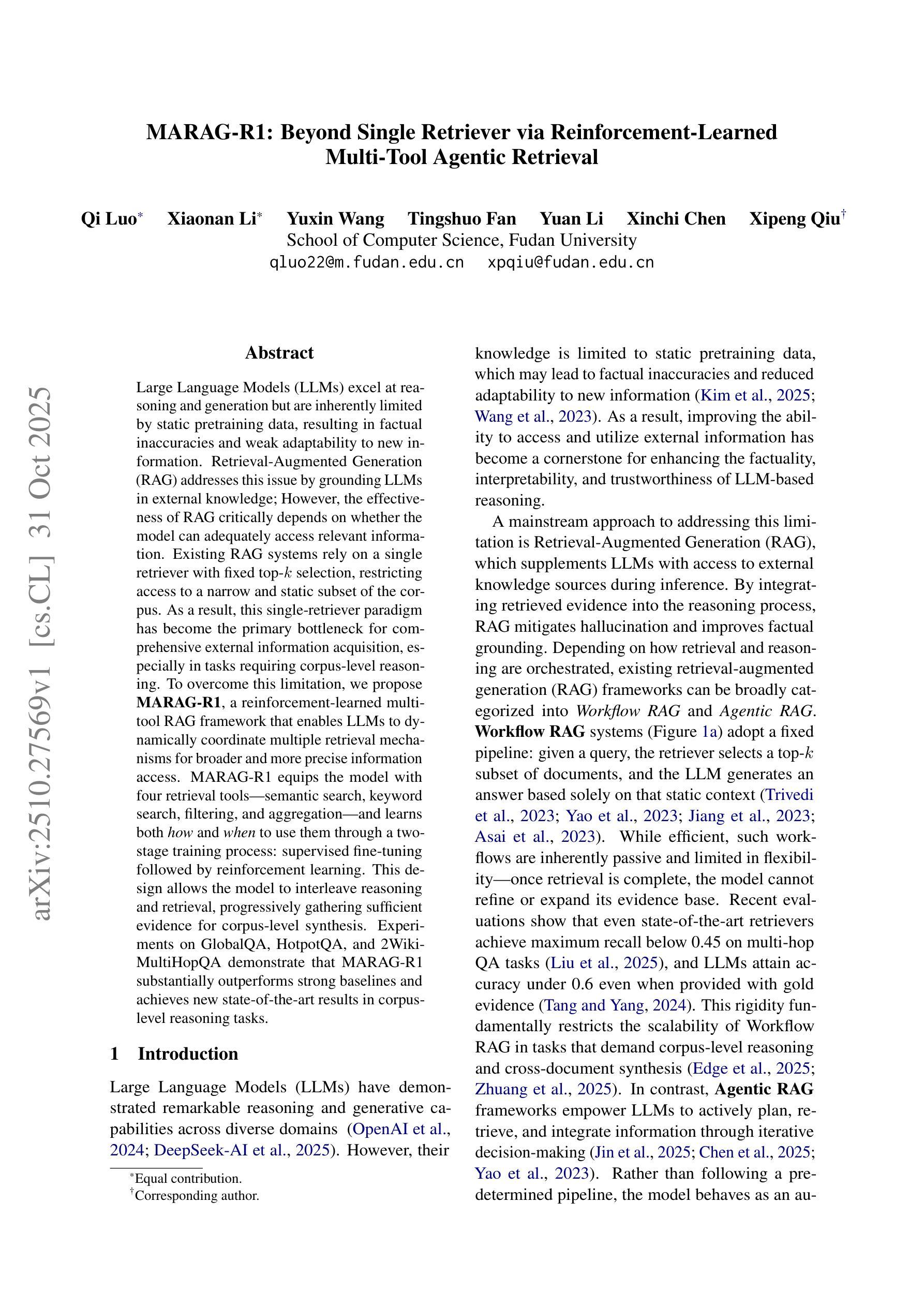 大型语言模型(LLM)在推理和生成方面表现出色,但由于静态预训练数据的固有局限性,存在事实性不准确和适应新信息能力弱的问题。检索增强生成(RAG)通过使LLM以外部知识为基础来解决这个问题。然而,RAG的有效性取决于模型获取相关信息的充分性。现有的RAG系统依赖于单一检索器,且只选择固定的前k个结果,这限制了从语料库中获取信息的范围。因此,单一检索器已成为全面获取外部信息的主要瓶颈,特别是在需要语料库级推理的任务中。为了克服这一局限性,我们提出了MARAG-R1,这是一个强化学习的多工具RAG框架,使LLM能够动态协调多种检索机制,以获取更广泛、更精确的信息。MARAG-R1配备了四种检索工具——语义搜索、关键词搜索、过滤和聚合,并通过两阶段训练过程学习何时以及如何使用这些工具:监督微调后跟着强化学习。这种设计允许模型在推理和检索之间交替进行,逐步收集足够的证据进行语料库级综合。在GlobalQA、HotpotQA和2WikiMultiHopQA上的实验表明,MARAG-R1显著优于强大的基线,并在语料库级推理任务中达到了新的技术水平。