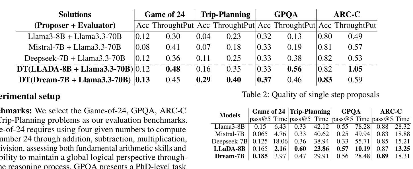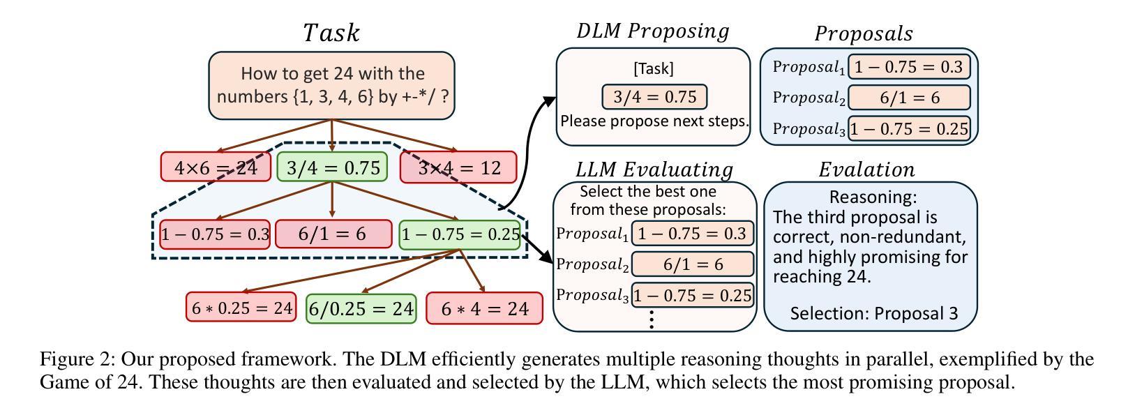 - 本研究提出了一个协作推理框架,结合DLMs和LLMs的优势,DLMs负责生成候选思考,LLMs负责评估质量。