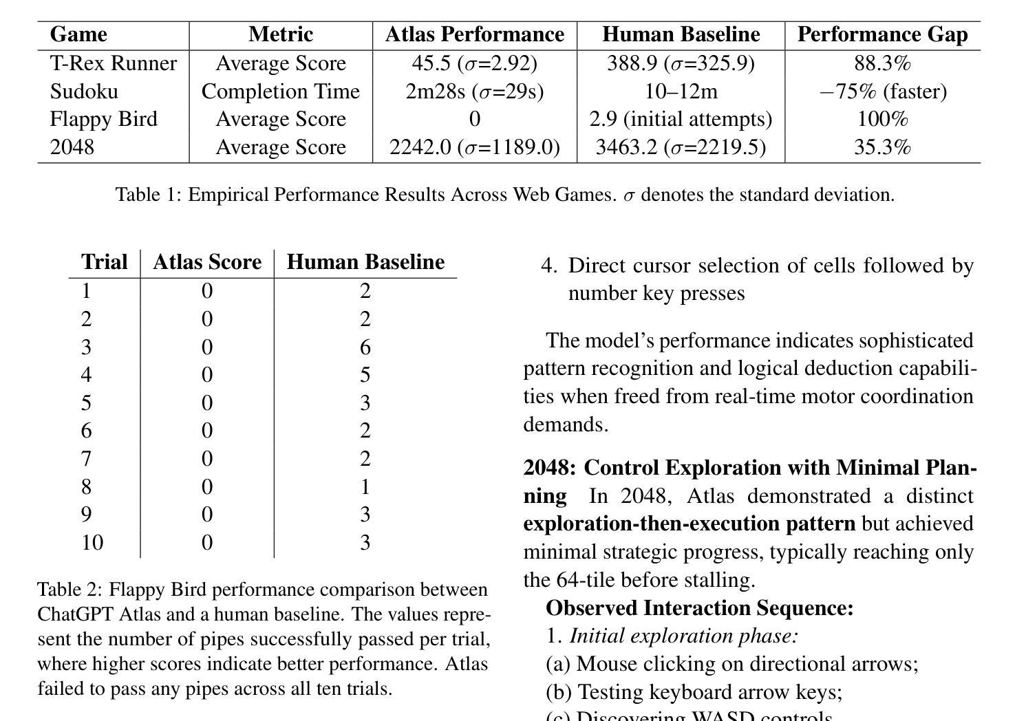 - 在需要实时互动和精确控制的游戏(如T-Rex Runner、Flappy Bird和Stein.world)中,Atlas表现挣扎,往往无法克服初始障碍。