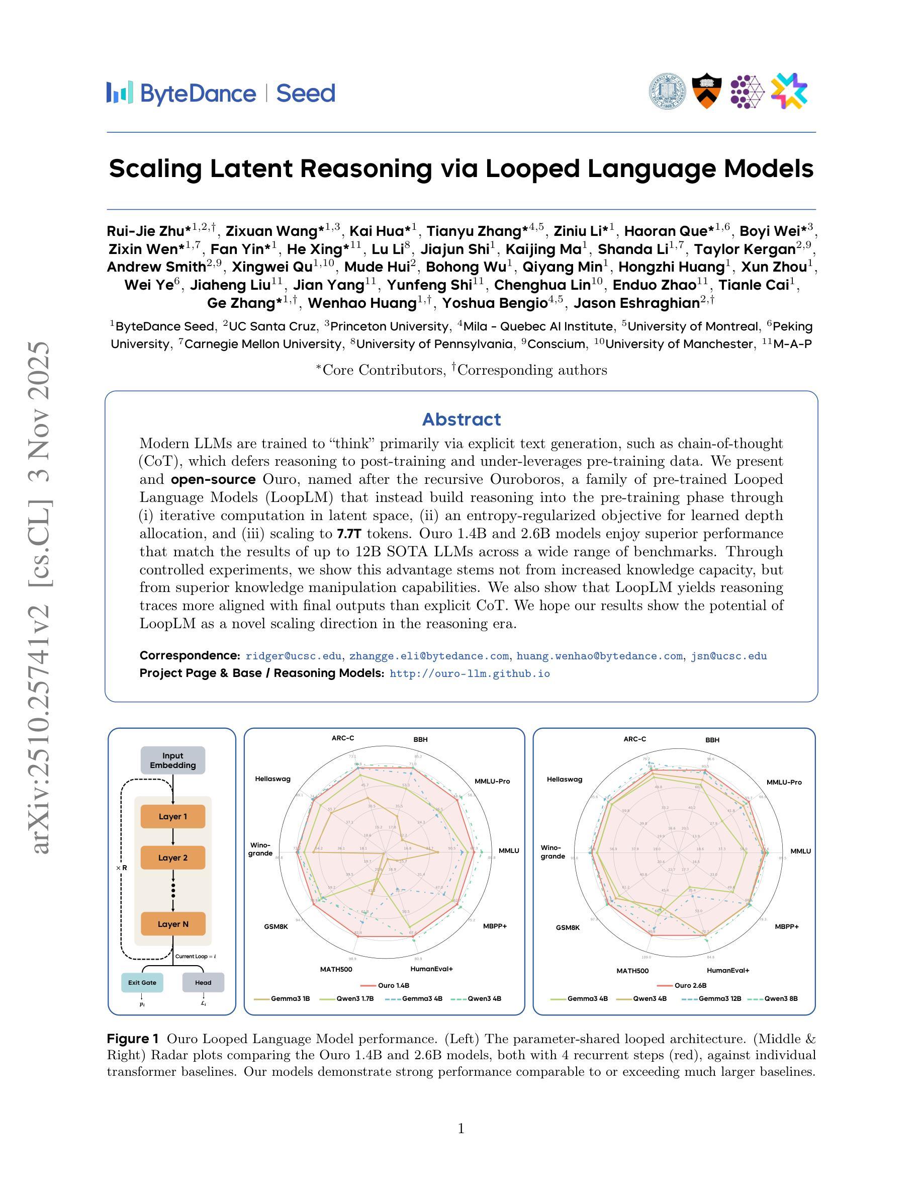 Modern LLMs are trained to “think” primarily via explicit text generation, such as chain-of-thought (CoT), which defers reasoning to post-training and under-leverages pre-training data. We present and open-source Ouro, named after the recursive Ouroboros, a family of pre-trained Looped Language Models (LoopLM) that instead build reasoning into the pre-training phase through (i) iterative computation in latent space, (ii) an entropy-regularized objective for learned depth allocation, and (iii) scaling to 7.7T tokens. Ouro 1.4B and 2.6B models enjoy superior performance that match the results of up to 12B SOTA LLMs across a wide range of benchmarks. Through controlled experiments, we show this advantage stems not from increased knowledge capacity, but from superior knowledge manipulation capabilities. We also show that LoopLM yields reasoning traces more aligned with final outputs than explicit CoT. We hope our results show the potential of LoopLM as a novel scaling direction in the reasoning era. Our model is available here: http://ouro-llm.github.io.