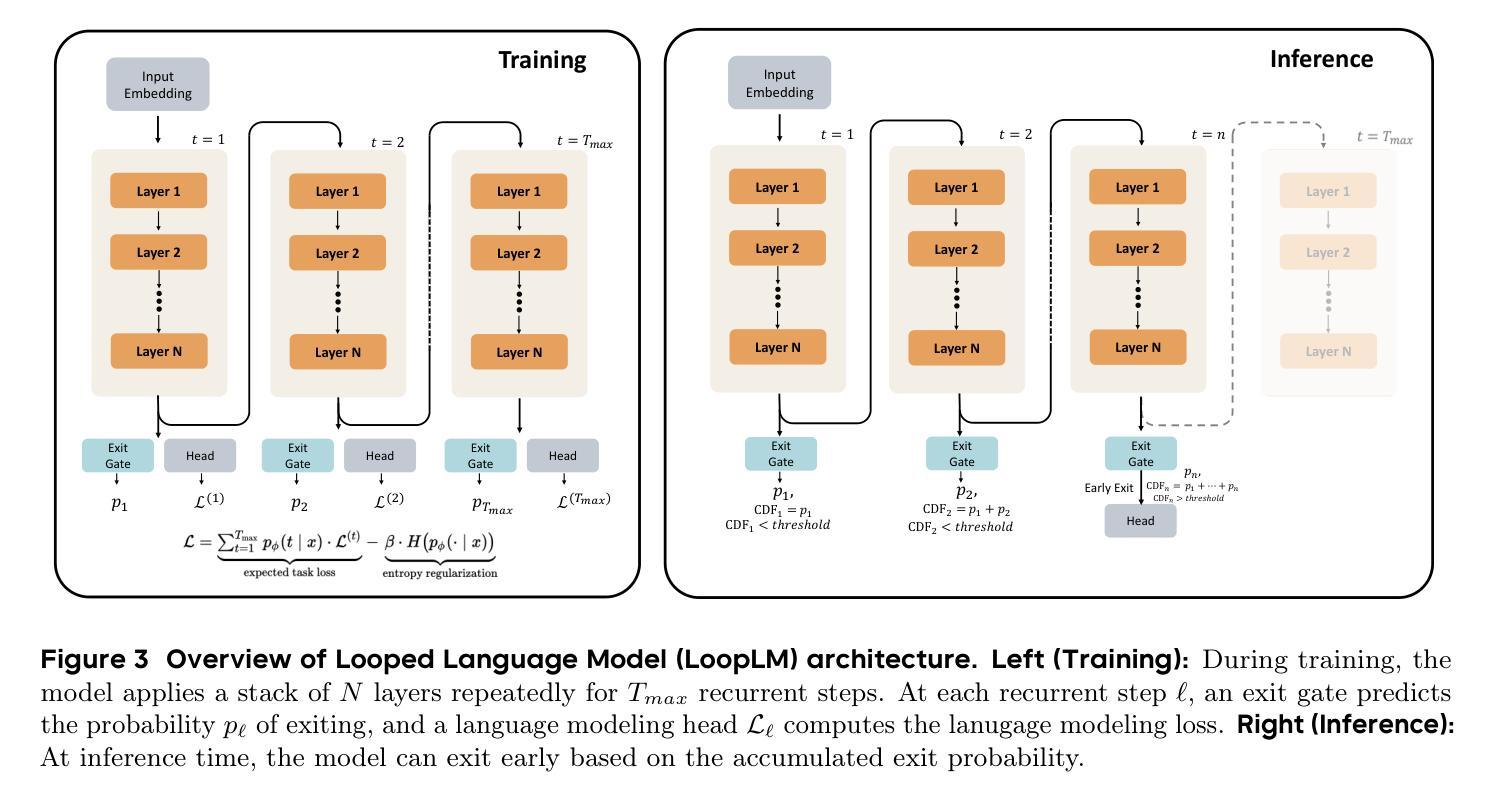 - LoopLM通过潜在空间中的迭代计算、熵正则化目标和扩展到大量令牌来提升性能。