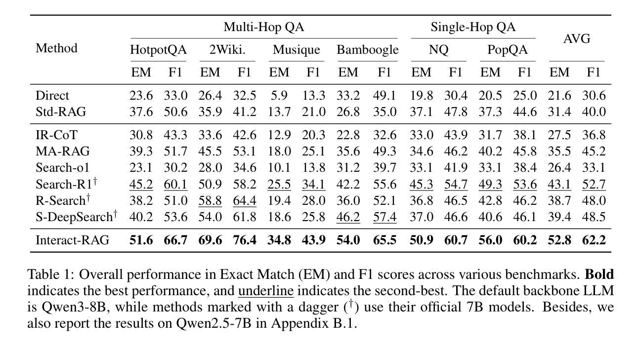 - 通过监督微调(SFT)和强化学习(RL)的训练,Interact-RAG在多个基准测试上表现优异。