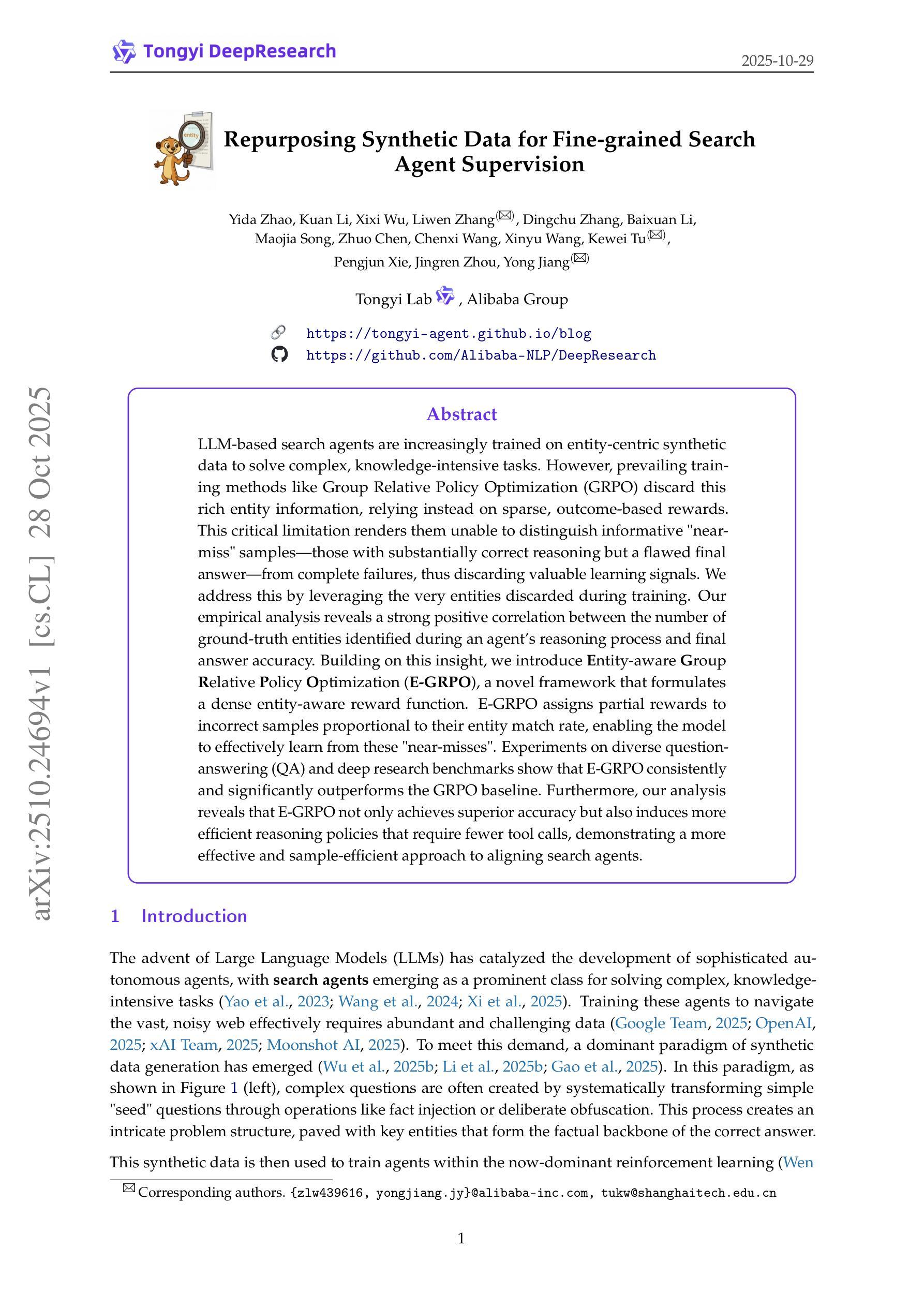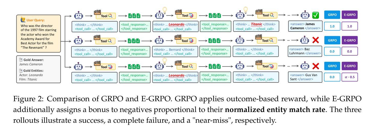 大型语言模型(LLM)搜索代理在实体为中心的合成数据上进行训练以解决复杂、知识密集型任务时表现出巨大的潜力。然而,当前普遍采用的训练方法(如群体相对策略优化GRPO)忽视了丰富的实体信息,依赖稀疏的结果导向奖励,导致无法区分信息丰富的“近错样本”(具有正确推理但答案有缺陷的样本)和完全失败的样本。为解决这一问题,我们利用训练过程中丢弃的实体信息,发现代理推理过程中识别的真实实体数量与最终答案的准确性之间存在强烈正相关关系。基于此,我们提出了实体感知群体相对策略优化(E-GRPO)的新框架,构建了一个密集的实体感知奖励函数。E-GRPO为错误样本分配部分奖励,奖励量与实体匹配率成正比,使模型能够从这些“近错样本”中学习。在问答和深度研究基准测试上的实验表明,E-GRPO在效率和准确性方面均显著优于GRPO。此外,我们的分析显示,E-GRPO不仅实现了更高的准确性,还产生了更高效的推理策略,需要较少的工具调用次数。它为我们提供了更有效地优化大型语言模型的方法。