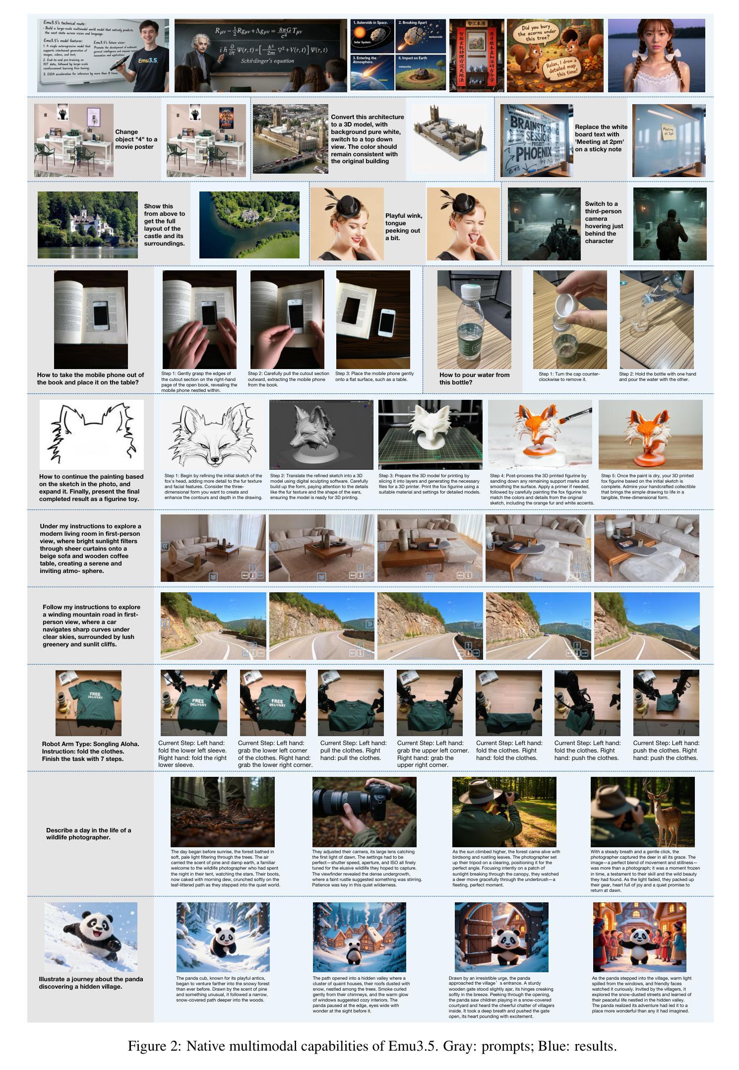 - Emu3.5具有通用世界建模能力,能够在不同的场景和任务中进行时空一致的探索和操作。