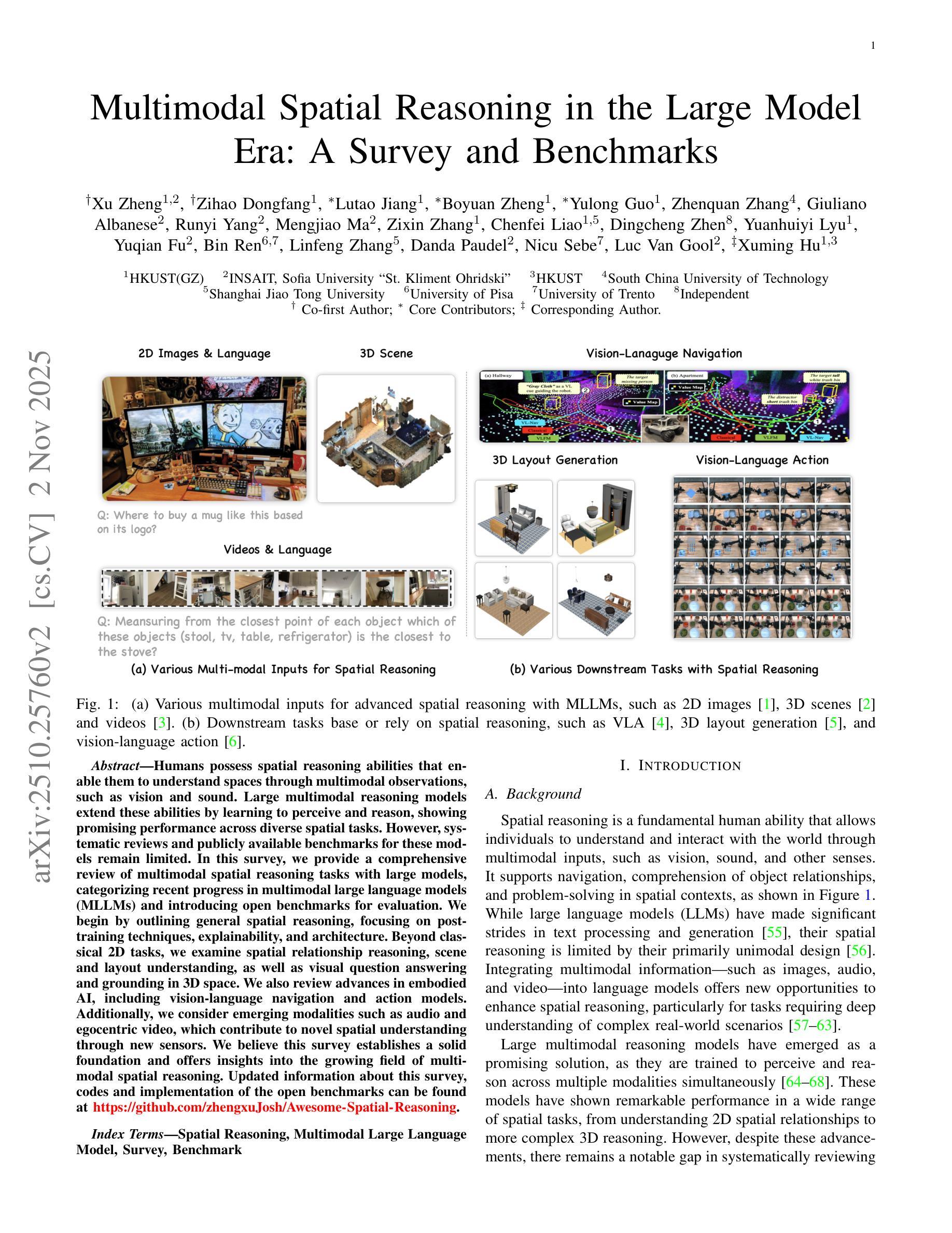 人类拥有空间推理能力,能够通过多模态观察(如视觉和听觉)理解空间。大型多模态推理模型通过学习和感知推理来扩展这些能力,在多种空间任务中表现出有前景的性能。然而,关于这些模型的系统性回顾和公开的基准测试仍然有限。在这篇综述中,我们全面回顾了使用大型模型的多模态空间推理任务,对近期的多模态大型语言模型(MLLM)进展进行分类,并介绍了用于评估的公开基准测试。我们首先概述一般的空间推理,重点关注后训练技术、解释性和架构。除了经典的二维任务外,我们还研究了空间关系推理、场景和布局理解,以及视觉问答和三维空间定位。我们还回顾了嵌入式AI的进展,包括视觉语言导航和动作模型。此外,我们还考虑了新兴的模态,如音频和自我中心视频,这些通过新传感器为新型空间理解做出了贡献。我们相信这篇综述为不断发展的多模态空间推理领域奠定了坚实的基础,并提供了深刻的见解。有关此综述的更新信息、代码和公开基准测试的实施,可以在https://github.com/zhengxuJosh/Awesome-Spatial-Reasoning找到。