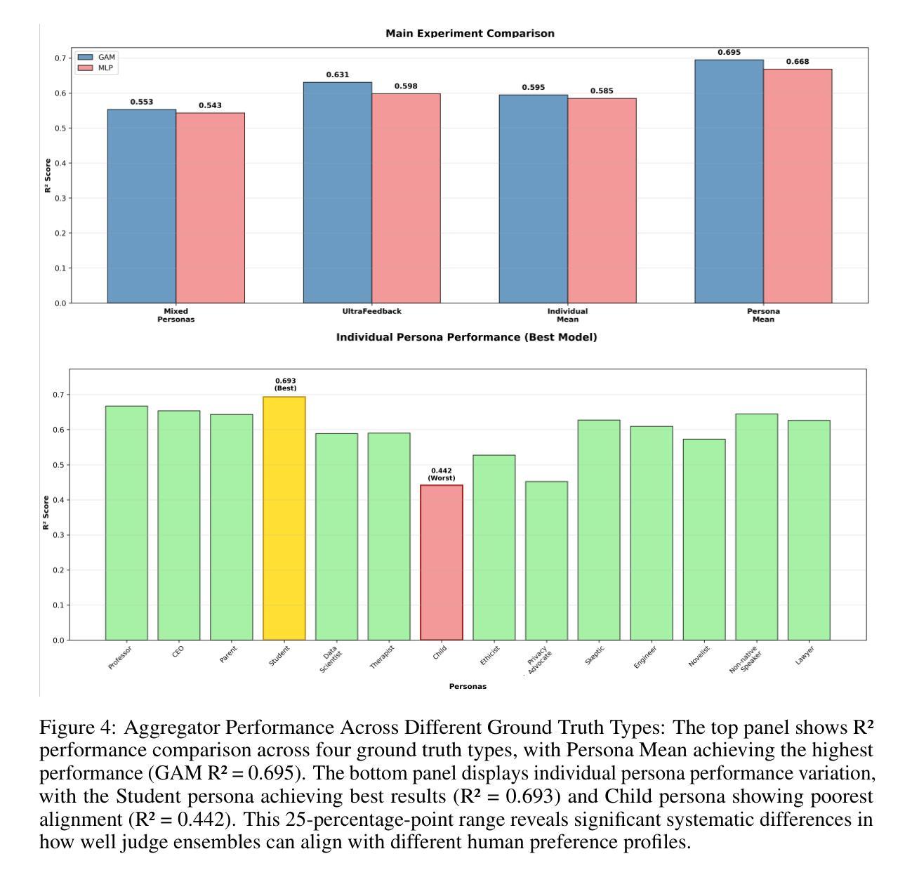 本文介绍了LLM在与人类偏好对齐方面所面临的挑战,包括校准困难、对评价标准的敏感性、偏见和不稳定等问题。为克服这些挑战,推进关键应用如基于人类反馈的强化学习(RLHF)的可靠奖励模型及针对特定用户查询选择最适合模型的有效路由系统。本文提出一种通过建模多种个性化偏好并学习整合多个基于评价标准的法官输出结果的框架。研究此方法的性能并评估其在应对人为偏见和LLM法官偏见方面的稳健性。主要贡献包括大规模合成偏好标签的个性化方法和两种独特的聚合器实现:广义可加模型(GAM)和多层感知器(MLP)。