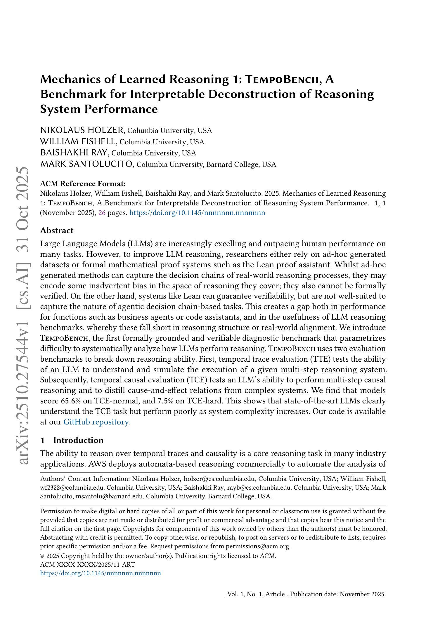Large Language Models (LLMs) are increasingly excelling and outpacing human performance on many tasks. However, to improve LLM reasoning, researchers either rely on ad-hoc generated datasets or formal mathematical proof systems such as the Lean proof assistant. Whilst ad-hoc generated methods can capture the decision chains of real-world reasoning processes, they may encode some inadvertent bias in the space of reasoning they cover; they also cannot be formally verified. On the other hand, systems like Lean can guarantee verifiability, but are not well-suited to capture the nature of agentic decision chain-based tasks. This creates a gap both in performance for functions such as business agents or code assistants, and in the usefulness of LLM reasoning benchmarks, whereby these fall short in reasoning structure or real-world alignment. We introduce TempoBench, the first formally grounded and verifiable diagnostic benchmark that parametrizes difficulty to systematically analyze how LLMs perform reasoning. TempoBench uses two evaluation benchmarks to break down reasoning ability. First, temporal trace evaluation (TTE) tests the ability of an LLM to understand and simulate the execution of a given multi-step reasoning system. Subsequently, temporal causal evaluation (TCE) tests an LLM’s ability to perform multi-step causal reasoning and to distill cause-and-effect relations from complex systems. We find that models score 65.6% on TCE-normal, and 7.5% on TCE-hard. This shows that state-of-the-art LLMs clearly understand the TCE task but perform poorly as system complexity increases. Our code is available at our \href{https://github.com/nik-hz/tempobench}{GitHub repository}.