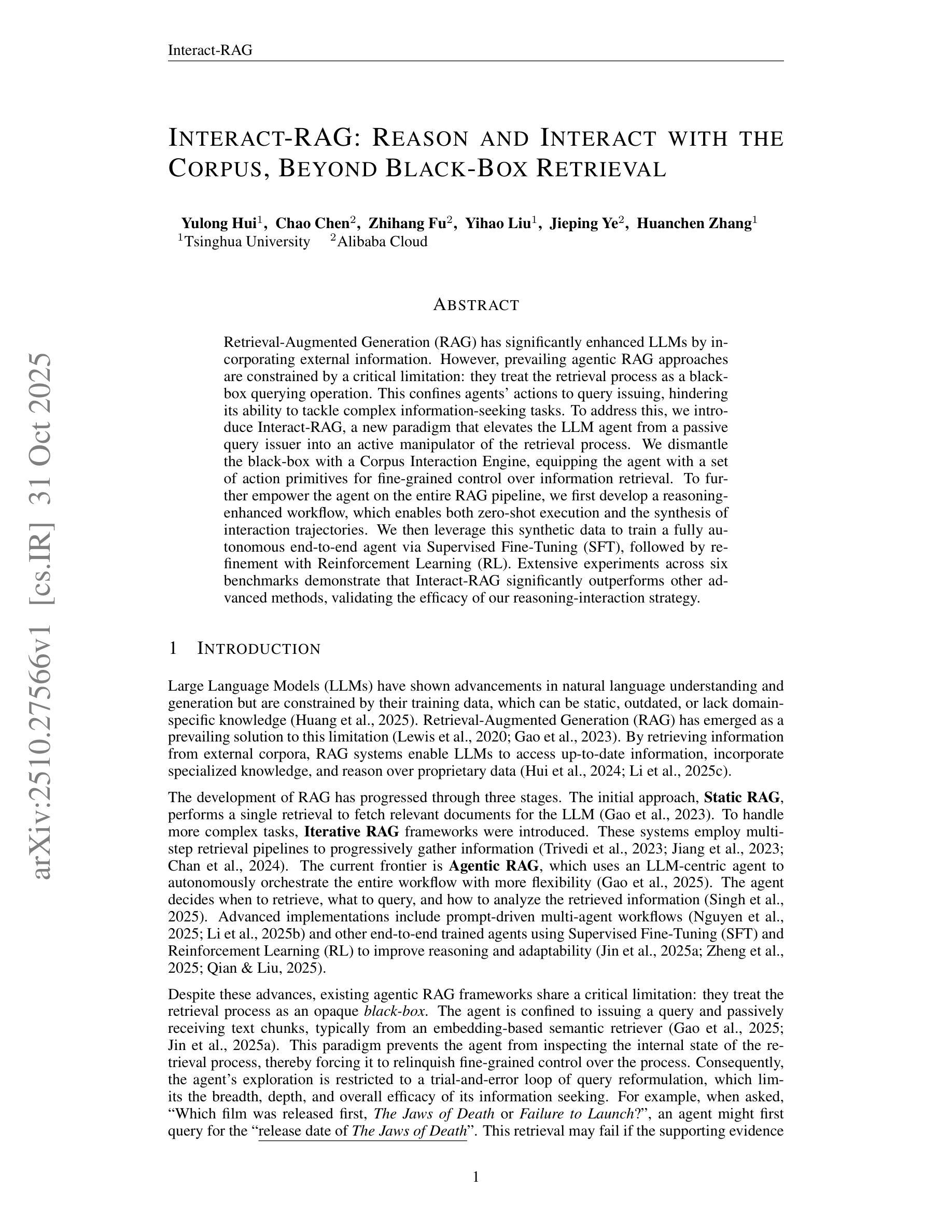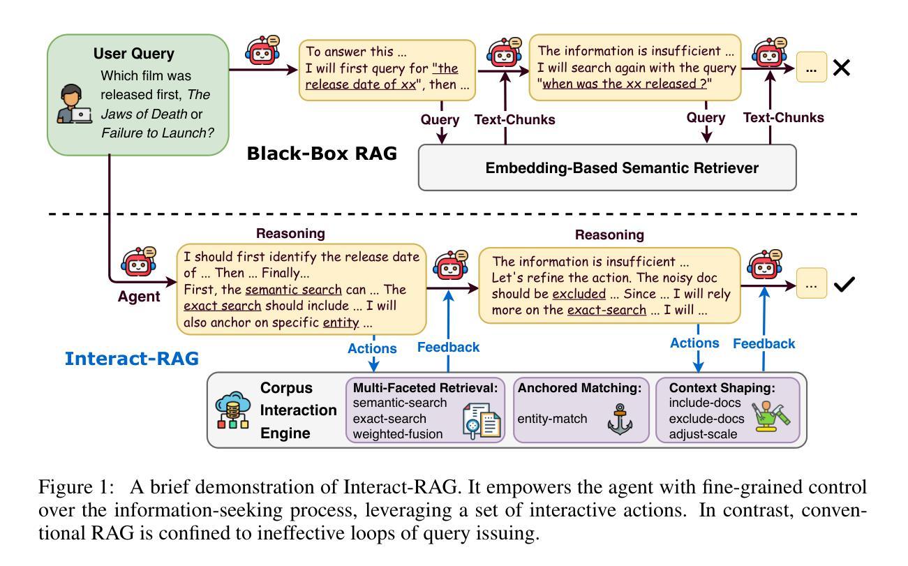 检索增强生成(RAG)通过融入外部信息显著增强了大型语言模型(LLM)。然而,当前流行的RAG方法受到一个关键限制:它们将检索过程视为黑箱查询操作。这限制了代理的操作仅限于查询发布,阻碍了其处理复杂信息检索任务的能力。为了解决这一问题,我们引入了Interact-RAG,这是一种新的范式,它将LLM代理从被动的查询发布者提升为检索过程的主动操纵者。我们通过语料库交互引擎破解了黑箱,为代理提供了一组动作原语,以实现信息检索的精细控制。为了进一步增强代理在整个RAG管道上的能力,我们首先开发了一个增强推理的工作流,它支持零执行合成交互轨迹。然后,我们利用这些合成数据通过监督微调(SFT)训练一个完全自主端到端的代理,随后通过强化学习(RL)进行微调。在六个基准测试上的大量实验表明,Interact-RAG显著优于其他先进方法,验证了我们推理交互策略的有效性。