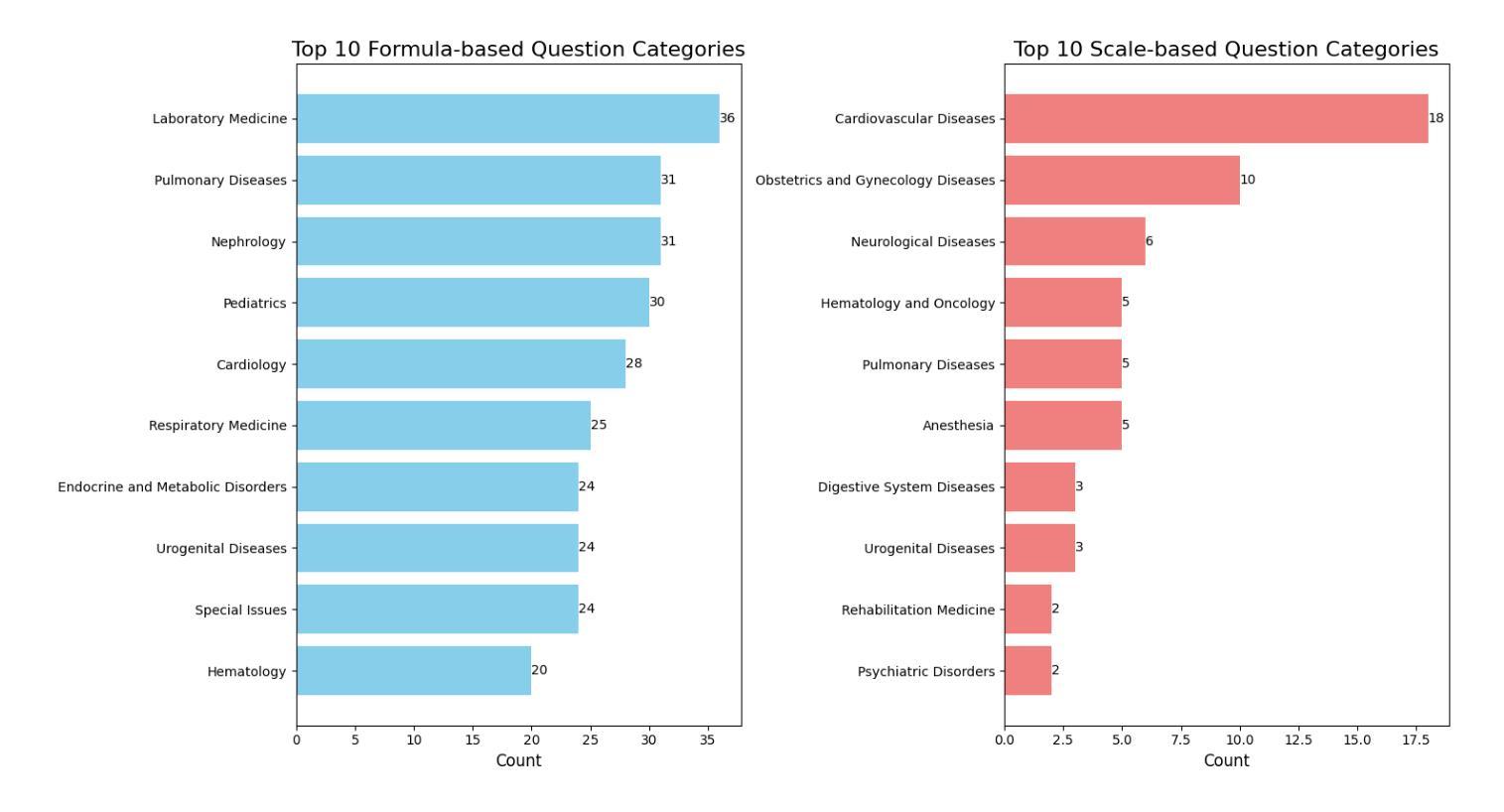 - MedCalc-Eval任务涵盖内部医学、外科、儿科和心脏病学等多个专业领域。