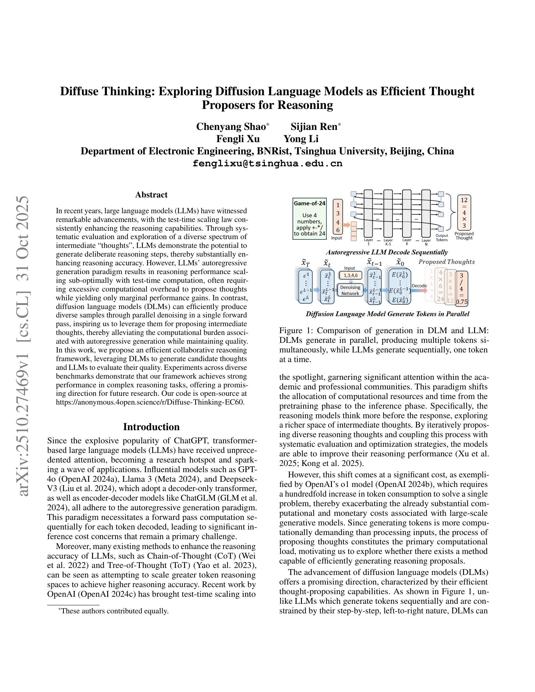 近年来,大型语言模型(LLM)取得了显著的进步,测试时的规模定律持续提高了其推理能力。通过对一系列中间思想的系统评估和探索,LLM展现出产生有意识的推理步骤的潜力,从而大大提高了推理准确性。然而,LLM的自回归生成模式导致推理性能在测试时的计算上无法以最优的方式扩展,通常需要过多的计算开销来提出思想,而获得的性能提升只有轻微。相比之下,扩散语言模型(DLM)可以在单次前向传递过程中通过并行去噪有效地生成各种样本,这启发我们利用它们来提出中间思想,从而在保持质量的同时减轻与自回归生成相关的计算负担。在这项工作中,我们提出了一个高效的协作推理框架,利用DLM生成候选思想,并利用LLM评估其质量。在多个基准测试上的实验表明,我们的框架在复杂推理任务中取得了良好的性能,为未来的研究提供了一个有前途的方向。我们的代码公开在https://anonymous.4open.science/r/Diffuse-Thinking-EC60。
