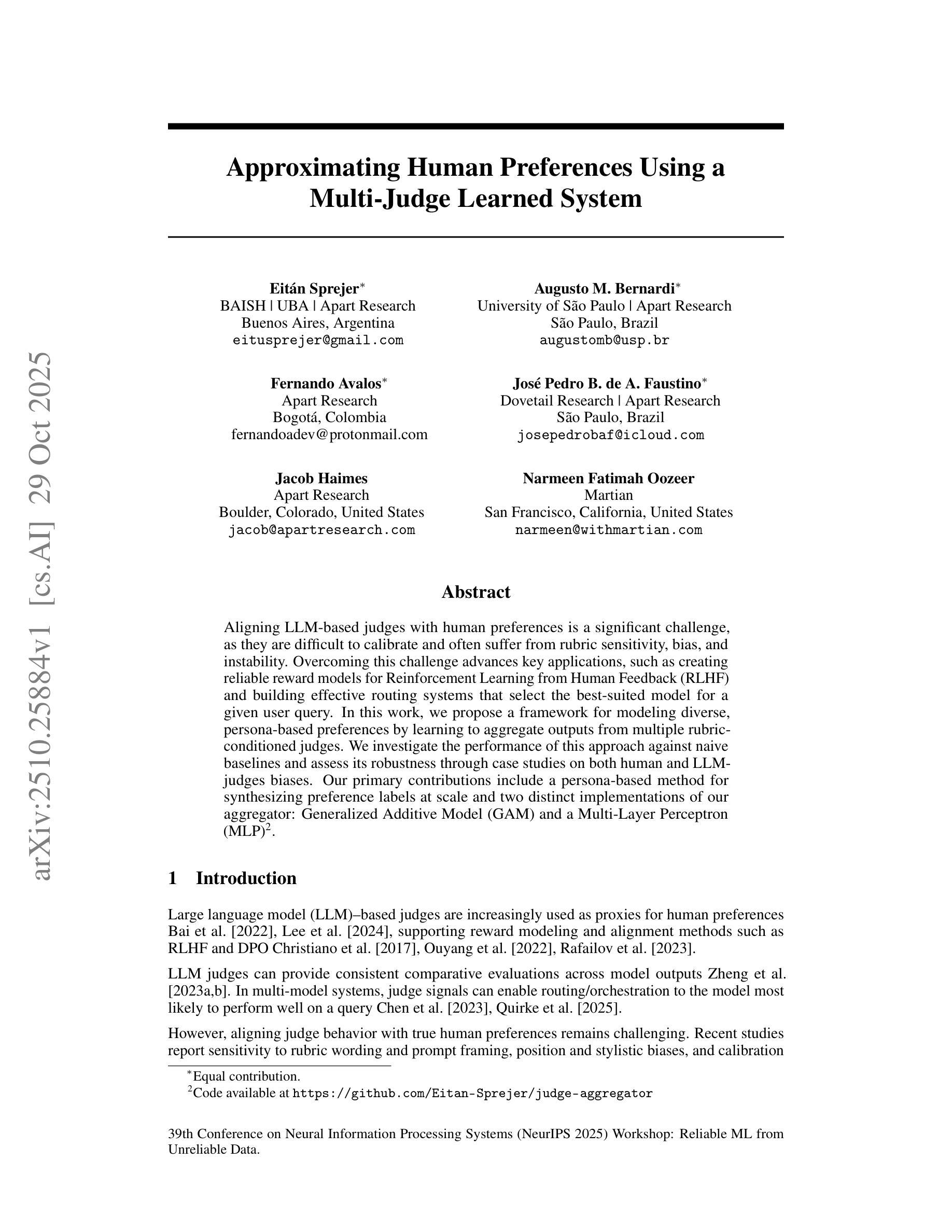 Approximating Human Preferences Using a Multi-Judge Learned System